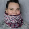 Size 3: the cowl is double thickness and constructed sideways, though the first half is worked as for size 2. Stitches from the completed first half are placed on hold while the second half is worked, then grafted together to create a side-to-side, double-thickness cowl.
