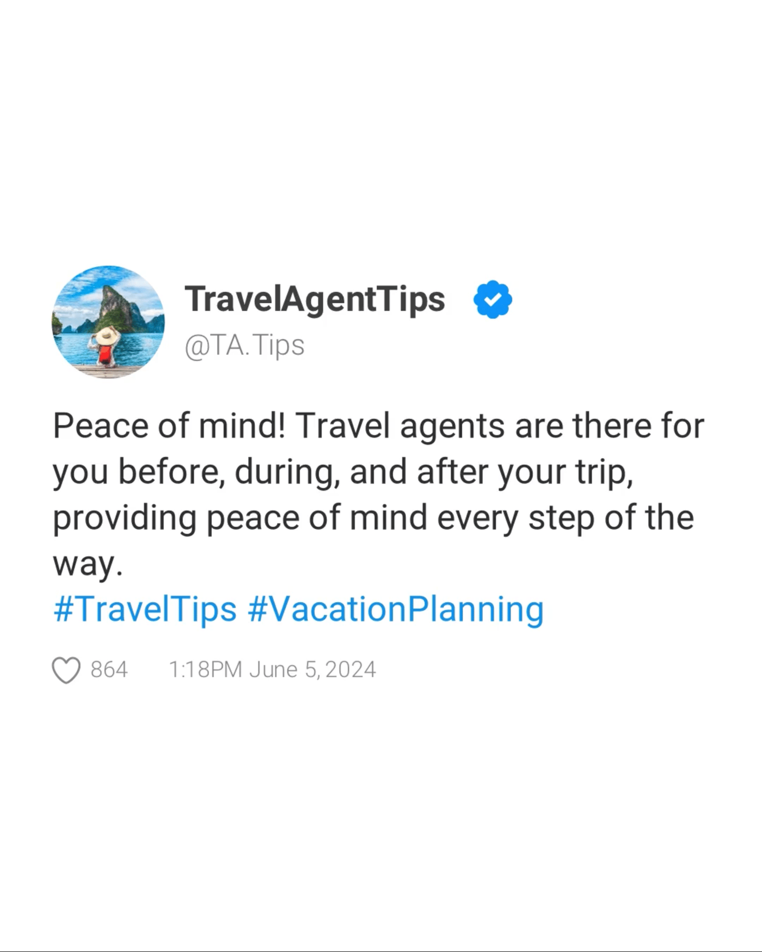 - "Peace of mind every step of the way! Let me, your Travel Agent, support you before, during, and after your trip. 🌴✨ #TravelPlanning #PeaceOfMind"