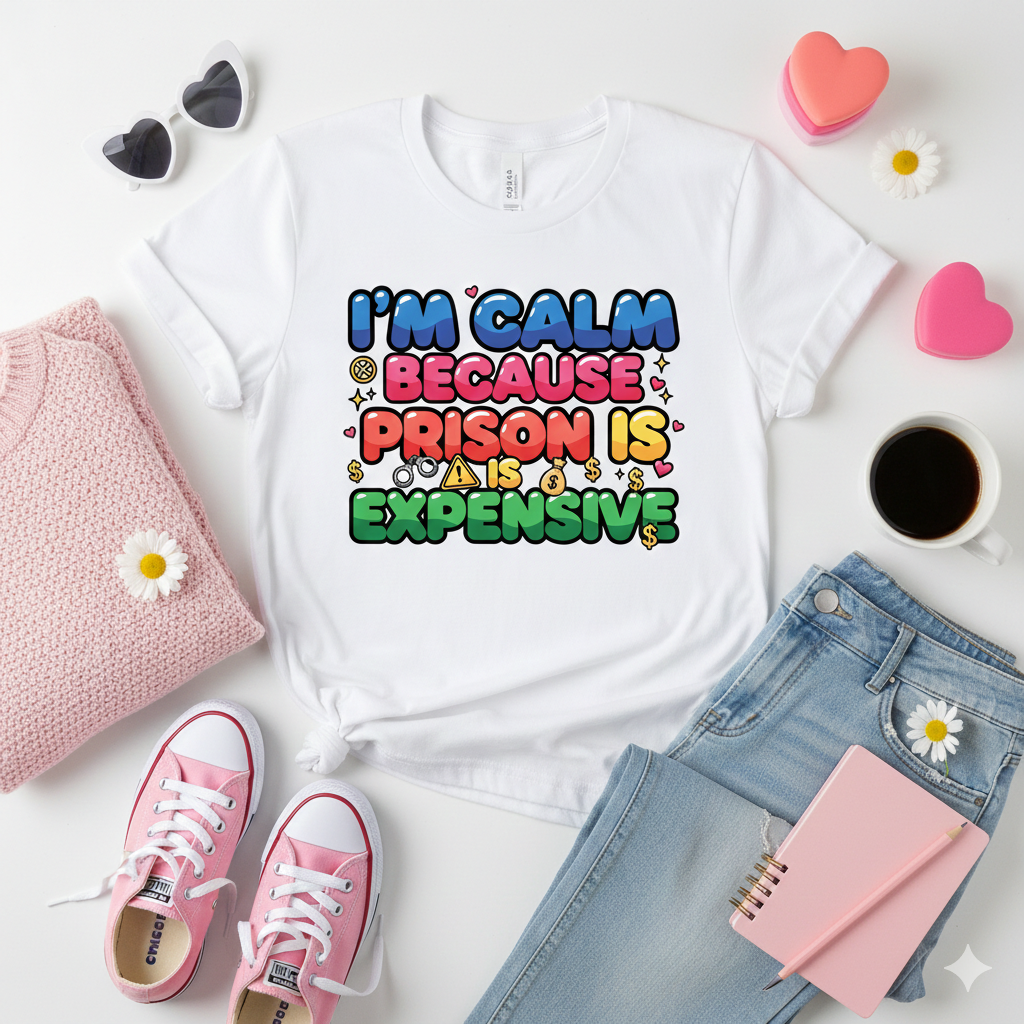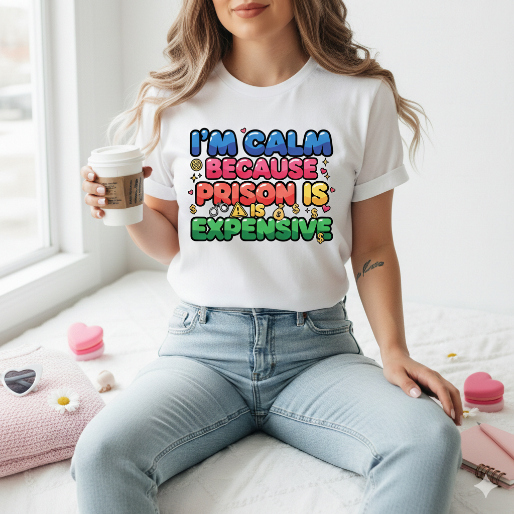 "I'M CALM BECAUSE PRISON IS EXPENSIVE": A hilarious, relatable statement for anyone staying peaceful for the sake of their bank account.