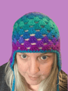 You read that right: FREE! Quick Granny Stitch cap with (optional I guess) earflaps, long ties, & tassels. Kind of adorable if you ask me.