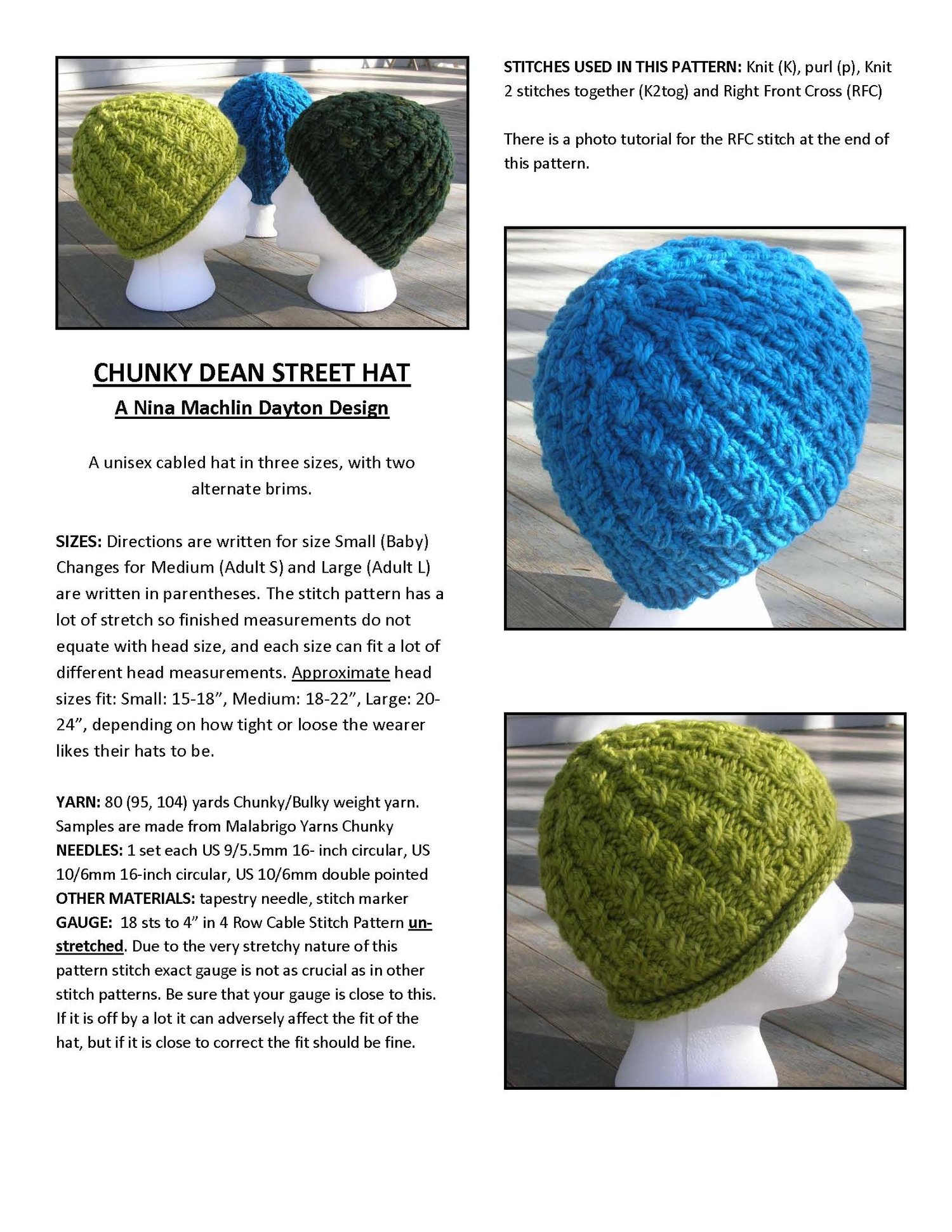 Pattern contains options for 3 sizes and 2 different brims, as well as a photo tutorial on the Dean Street cable pattern.