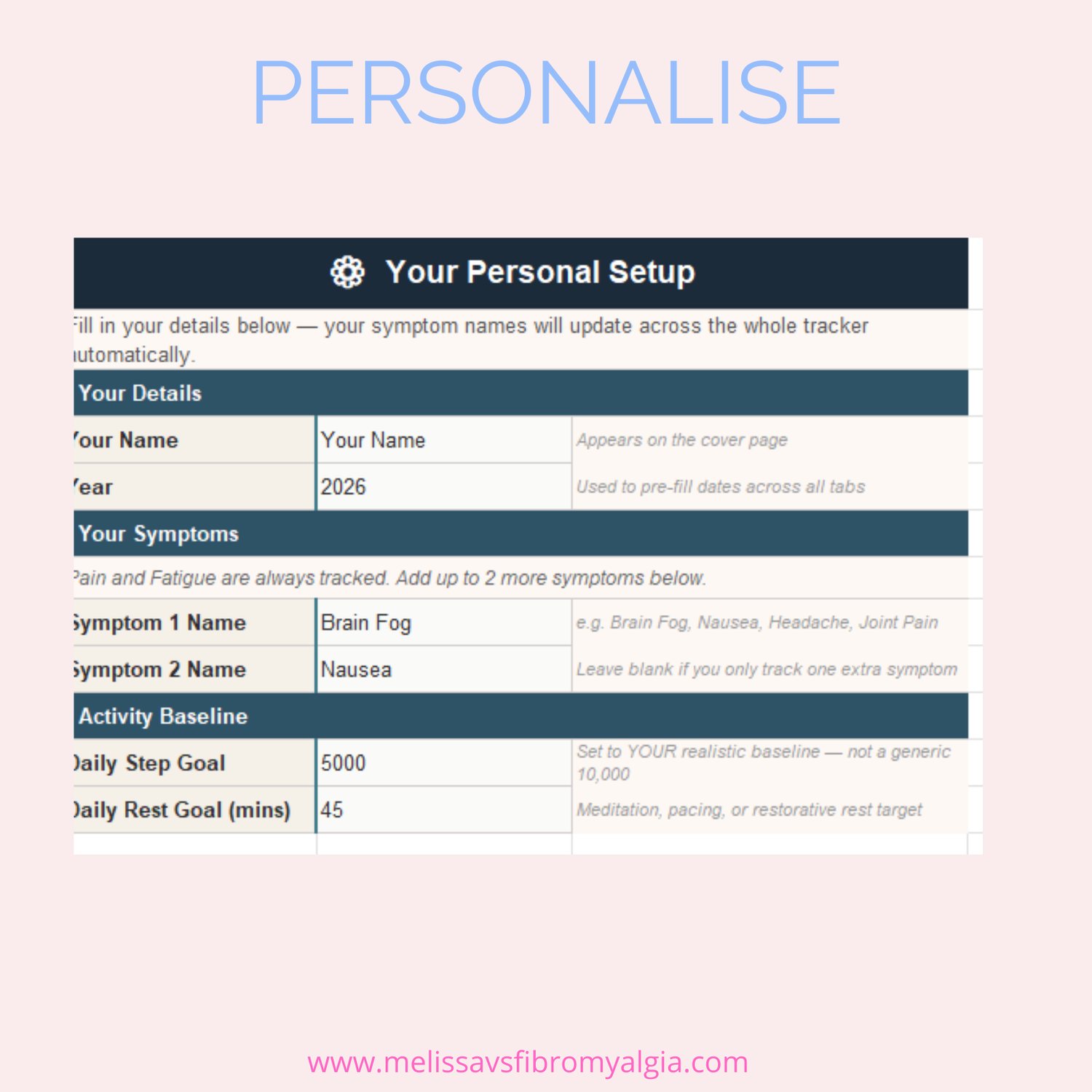 Enter your name and your symptom names once. They populate across all twelve months and the dashboard automatically. You'll never have to rename a column by hand.