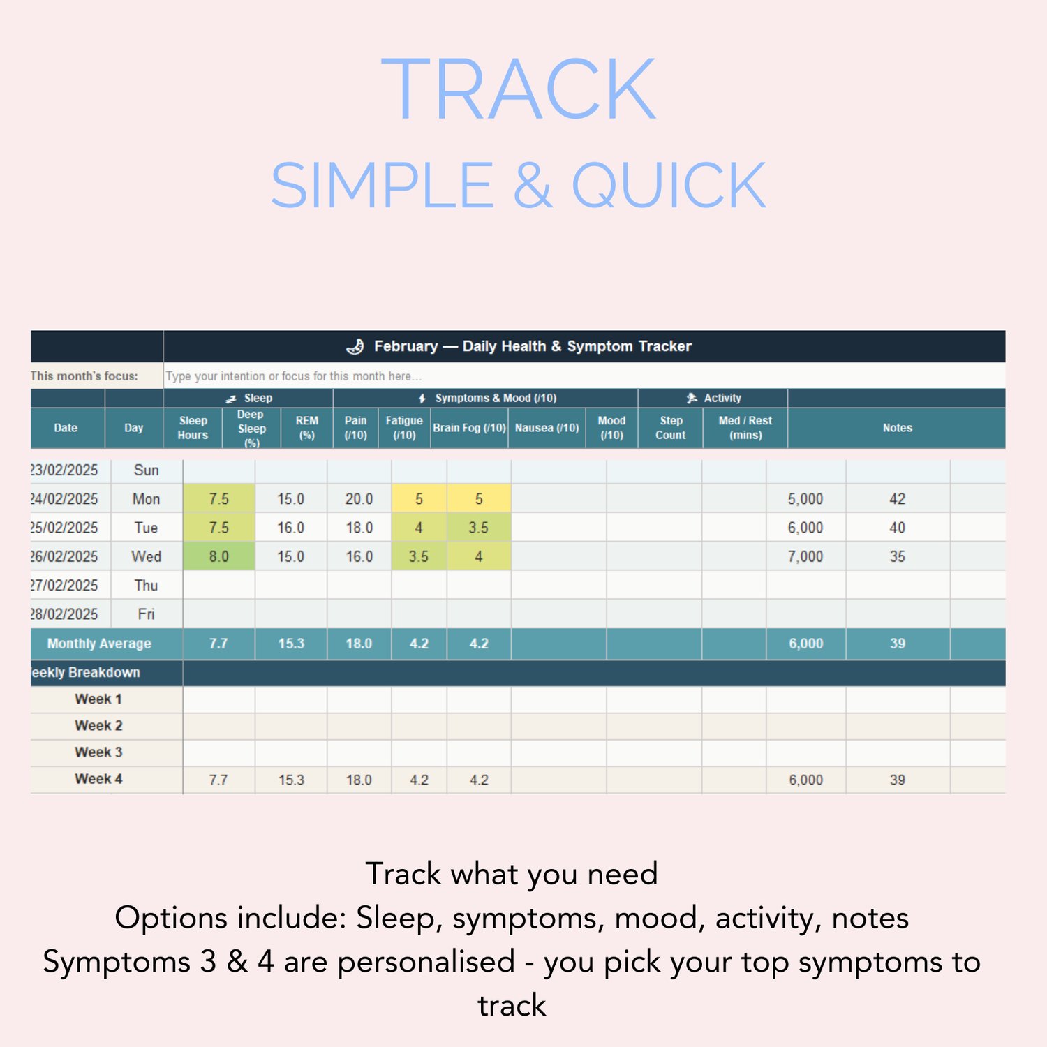 Yes — that's one of the most important features. There are two symptom columns you name yourself on the Setup tab. They update automatically across every month tab and the dashboard. You track what matters to you, not a generic list.