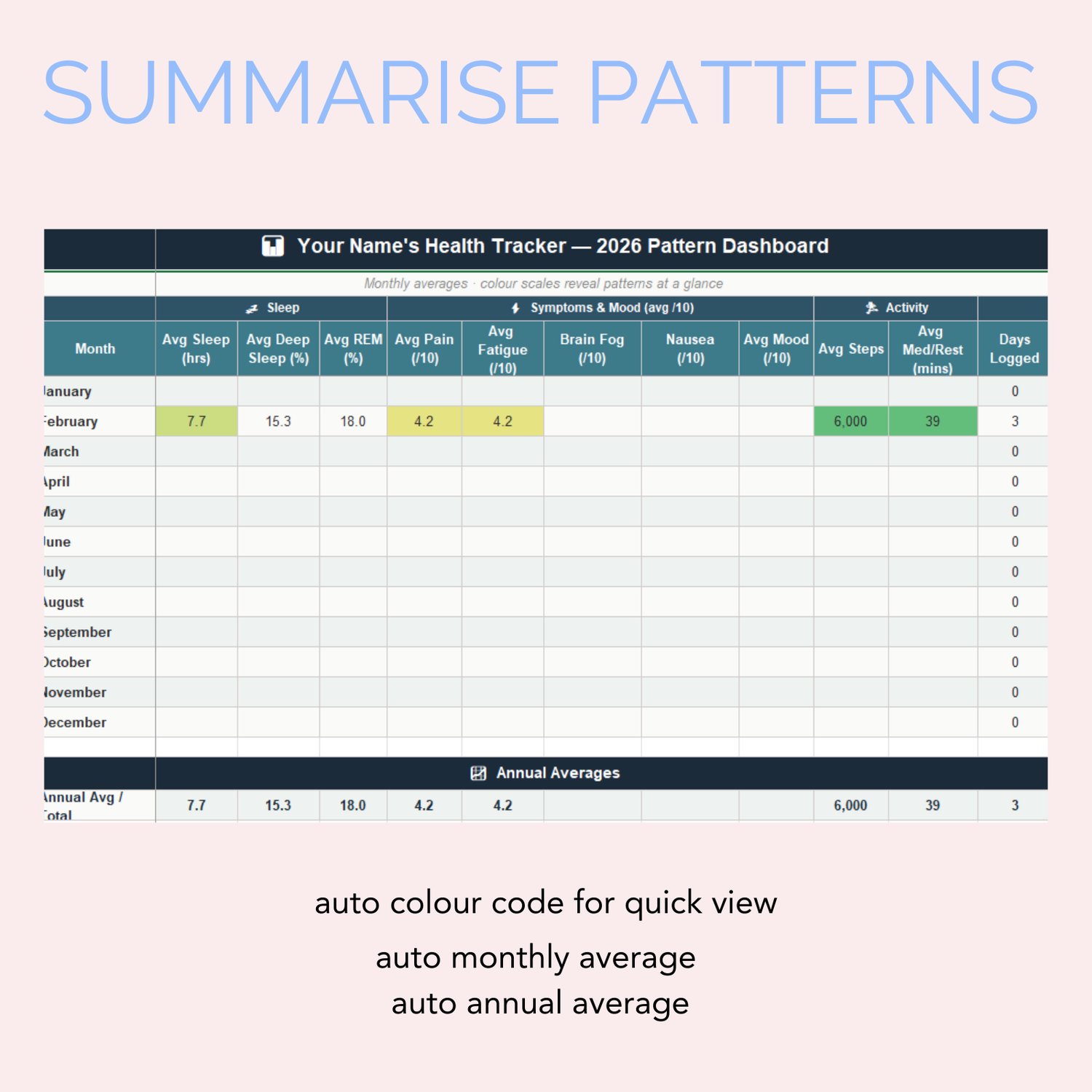 One tab that pulls the monthly averages from all twelve months side by side. The whole year, colour-coded, at a glance.