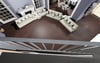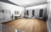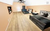 lively indoor gathering in a residential space. The room is well-lit and modern, with hardwood flooring, large windows, and a fireplace as a central feature a gray sectional sofa, with others standing nearby. The decor includes a wall clock, a decorative plant, and abstract artwork. Personal items, such as bags and slippers, are scattered around, indicating a relaxed and informal atmosphere.
