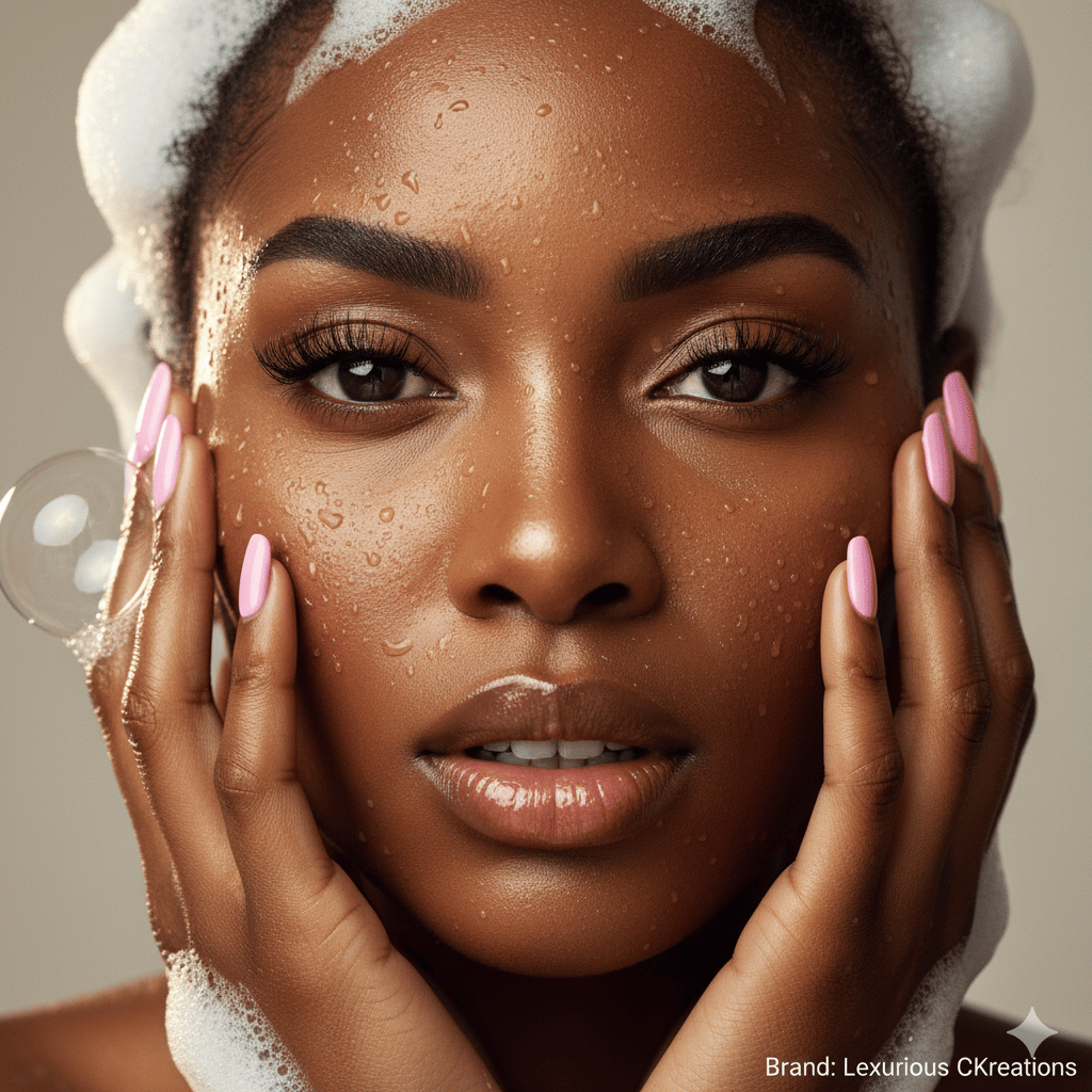 This luxurious AI art prompt captures radiant, dewy perfection. Featuring a close-up of an African American woman with glowing brown skin, soft water droplets, and vibrant pink nails, it brings skincare-inspired beauty to life in cinematic realism. Perfect for artists and creators focused on high-end, editorial-quality portraits.