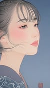 his bijinga shows elements of traditional Japanese paintings, especially ukiyoe bijinga and Takehisa Yumeji. The soft and delicate contour, transparent skin expression, and elegant expression are impressive. The color tone of the background and the costume is also modest, and the whole thing exudes calm beauty and tranquility. The composition of the profile with bold margins emphasizes the tranquil beauty. In addition, each hair is carefully drawn and the gradation of smooth skin is very high quality.