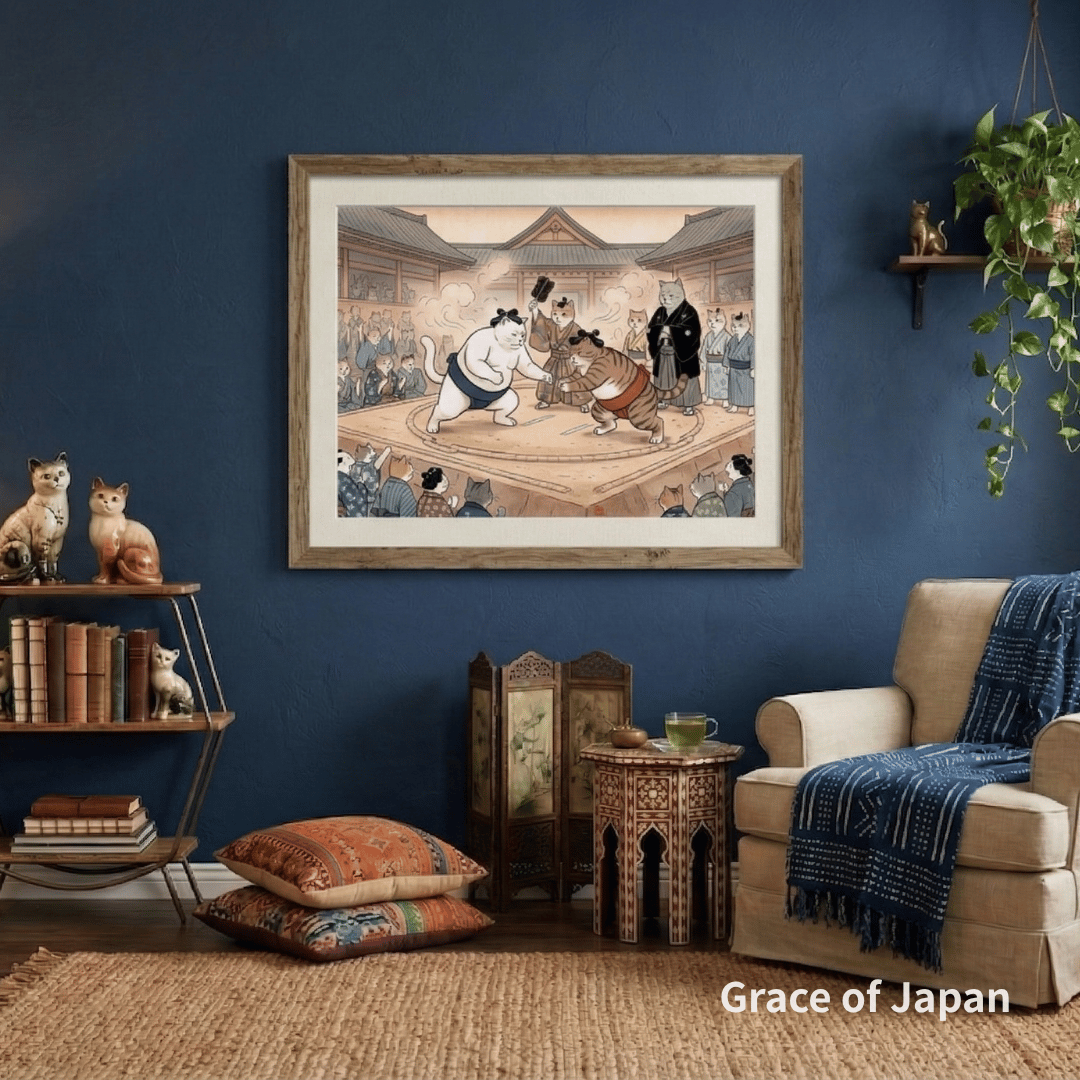 This funny cat poster combines the energy of a sumo match with the decorative appeal of Japanese-inspired home decor. The detailed crowd, traditional setting, and expressive sumo cats make this cat printable a memorable piece for a living room, home office, studio, reading nook, or gallery wall. It works beautifully as Japan decor, cat lover wall art, or a gift for someone who enjoys unique printable wall art.