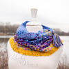 Sample used Yarn Over New York Times Square, 463yds/100g in First Officer (main color) and 92yds/20g in each color of the Moonwake set (contrast colors), consisting of Don’t Panic, Peacock (cc1), Lago Fiori (cc2), Velveteen (cc3), Dew Jewels (cc4), Queen Bee (cc5)Thanks to Yarn Over New York for providing the yarn for the pattern sample!