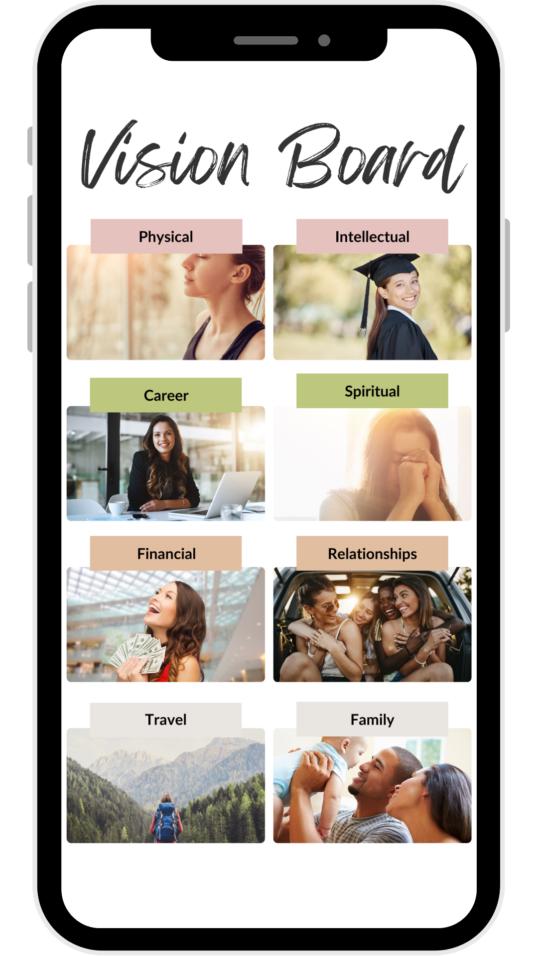This comprehensive vision board template organizes your aspirations across eight essential life dimensions, creating a harmonious roadmap for intentional living. With its clean, structured layout, each category invites you to envision growth in every area that matters.