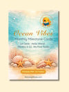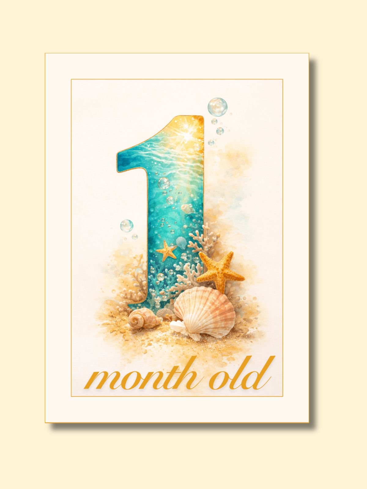 Soft underwater watercolor in turquoise and teal. Golden starfish, translucent bubbles, tiny seashells, and gentle coral scattered across each card. A calm, coastal nursery aesthetic.