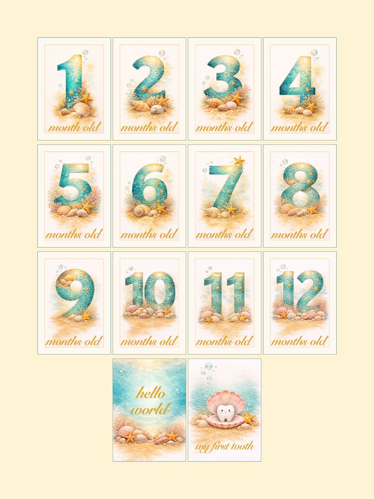 Ocean Vibes Monthly Milestone Cards — 14 Printable Baby Photo Cards | Hello World, Months 1–12, First Tooth | 5×7 Printable PDF