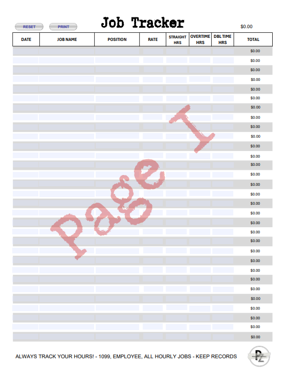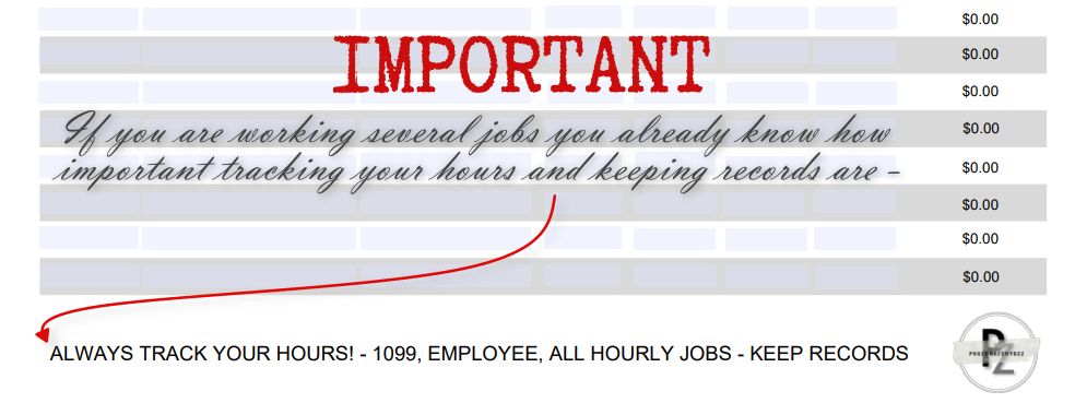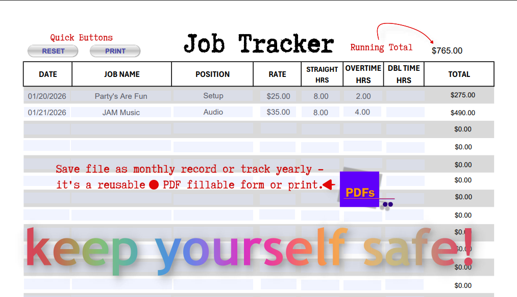 The Track Your Hours – Job Tracker PDF automatically calculates your hours based on your rate and keeps a running total as you work. Just enter your hours, save the file with your job name, and reuse or print it whenever you need. It’s an easy way to stay confident that your time, totals, and paycheck all match.