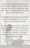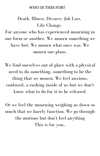 For anyone who has experienced mourning in one form or another. We mourn something we have lost. We mourn what once was. We mourn our plans.