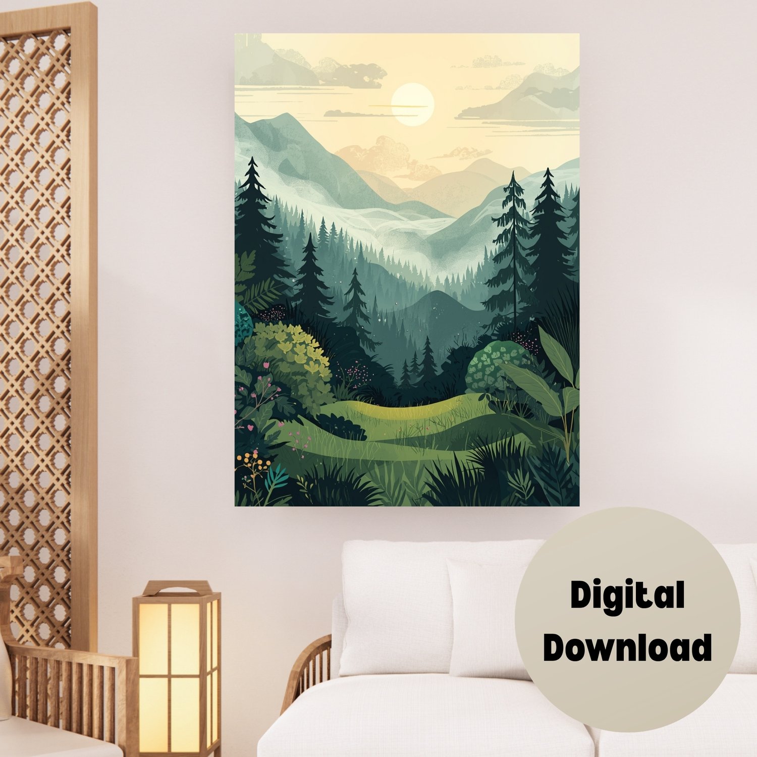 Step into a world of calm and quiet beauty with this dreamy forest landscape illustration. Featuring misty mountains, soft lighting, and a peaceful natural setting, this artwork captures the essence of serenity and escape.