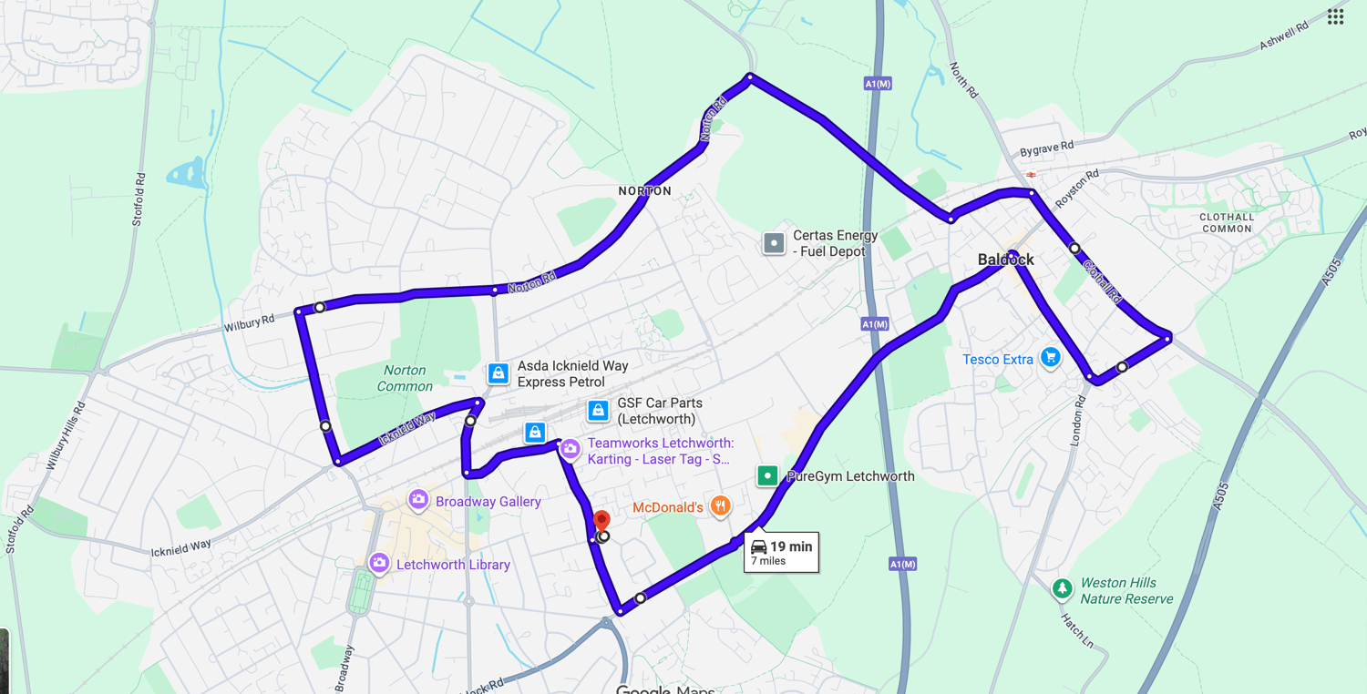 Practise real driving test routes in Letchworth before your exam – open directly in Google Maps