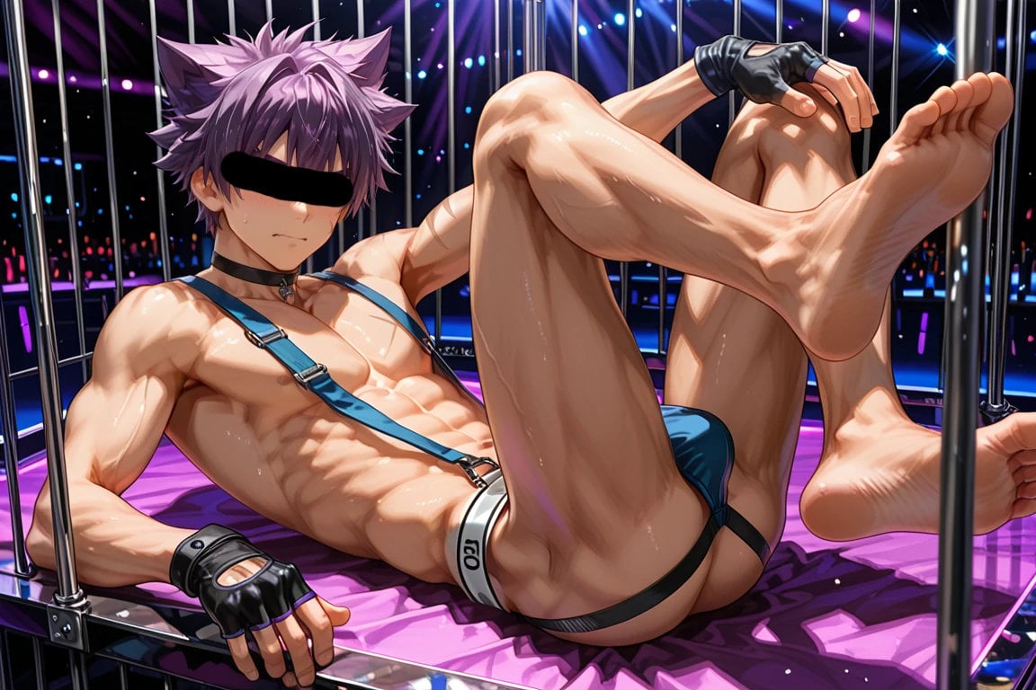 男性ショーダンサーをテーマに、ジョックストラップとサスペンダーを着せて、ポールと鳥かごをテーマに、キャラクターの魅力を存分に表現しました。