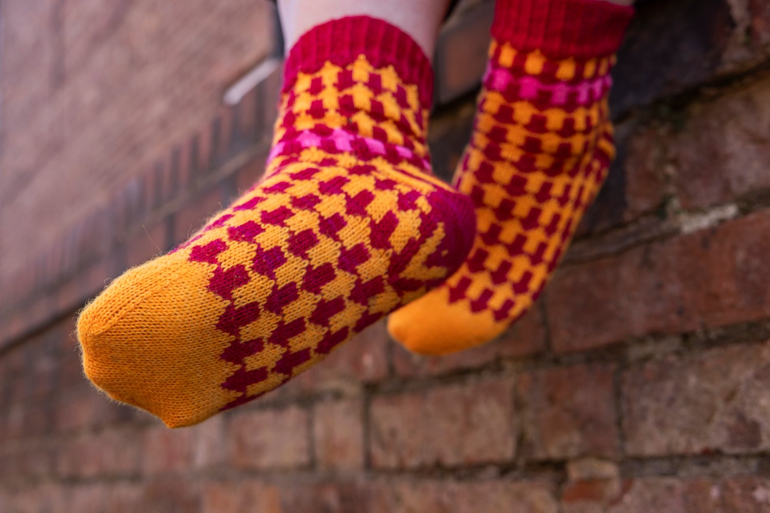 Choose two contrasting colours of 4ply/fingering yarn suitable for socks. I wouldn’t recommend using highly variegated yarn with this design.