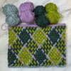 Recommended Yarn: Koigu Yarns KPM 50 g; 2150 (MC1 - dark green), 1521 (MC2 – bright green), 5513 (CC1 – blue), 2260 (CC2 – pink); 1 skein each