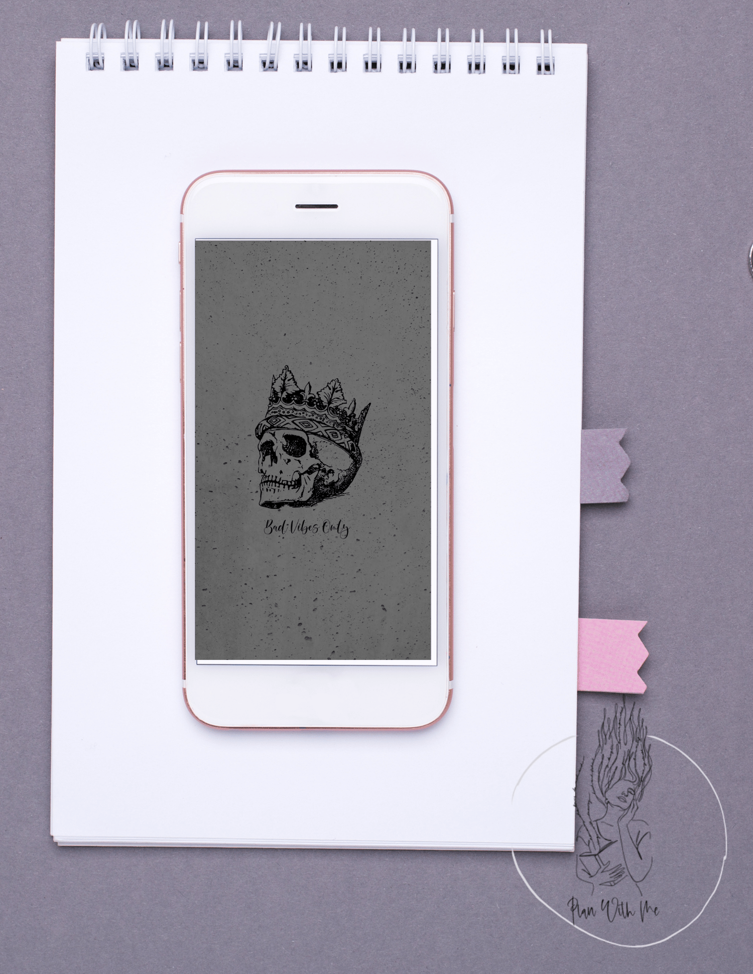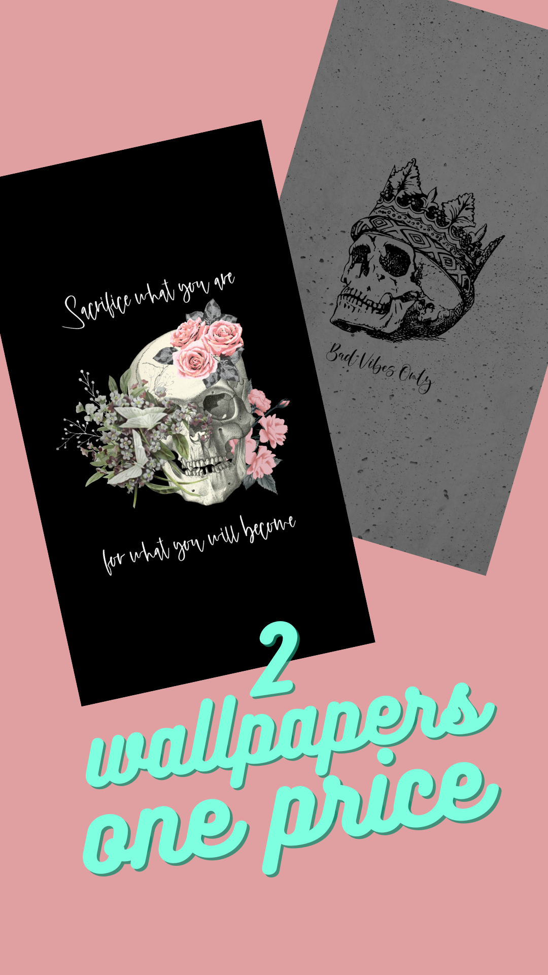 Change is hard and scary, but sometimes, we have to do scary things to become the most awesome version of ourselves. Show the world you're not only a smarty pants for knowing this, but you've got amazing taste as well! A skull with florals reads "Sacrifice what you are for what you can become" (a quote by Eric Thomas, PhD) on a black background. Then a funsie "Bad vibes only" with a killer crowned skull for your second download for those days when you just cant with the positivity. Two awesome wallpapers for an awesome person....YOU!