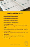 "Mental Health & Self-Care – Journals, Affirmations, Anxiety Management" is a comprehensive guide designed to support individuals on their journey toward improved mental health and emotional well-being. This eBook offers practical tools, insights, and techniques that empower readers to manage stress, anxiety, and emotional challenges, while fostering a deeper connection to themselves through self-compassion and self-care.