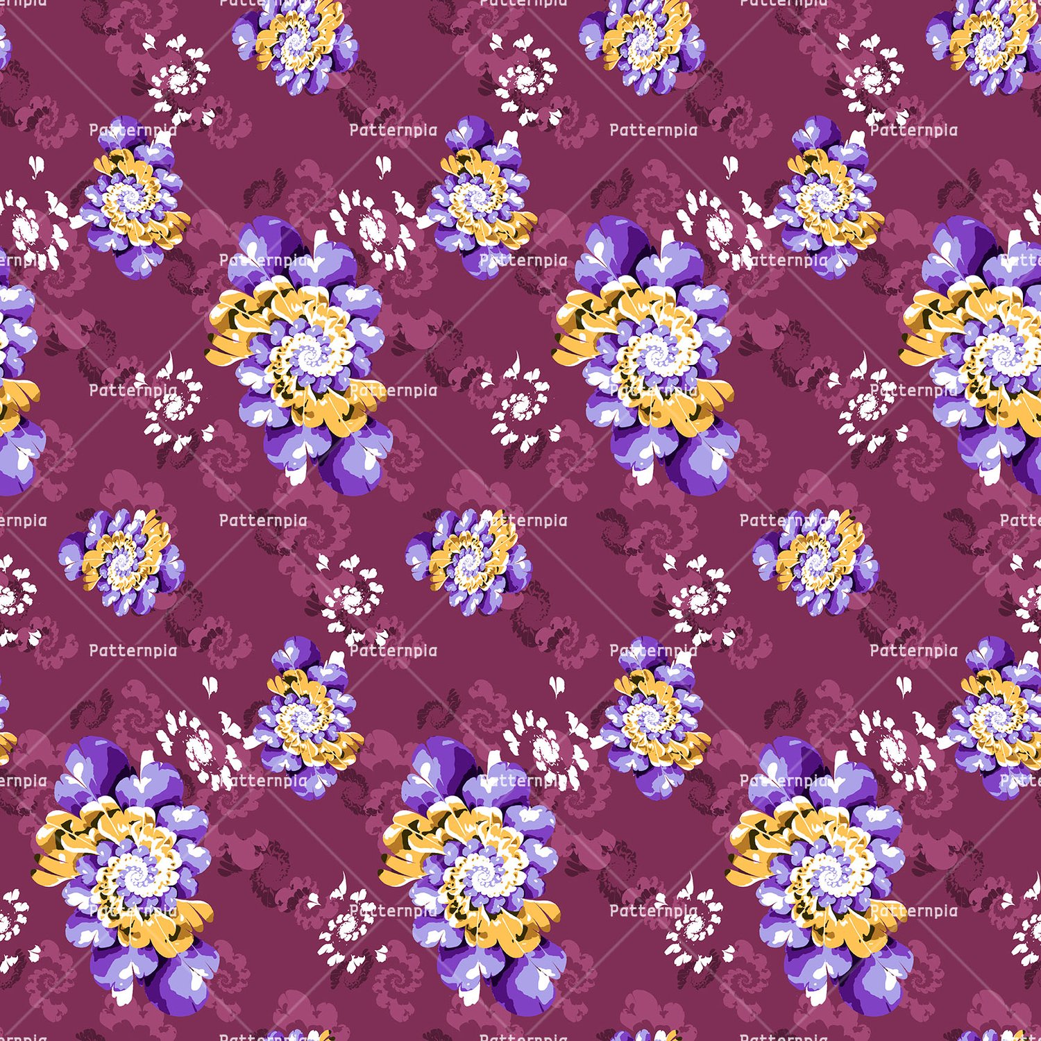 Intricate spiral floral motifs in purple and gold on a deep plum ground.