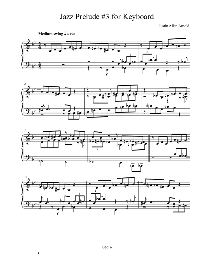 Contrapuntal jazz prelude in Bb major for solo piano/keyboard by Justin Allan Arnold. 2-page PDF doc. Audio version here: http://justinallanarnold.bandcamp.com/track/jazz-prelude-3-for-keyboard