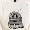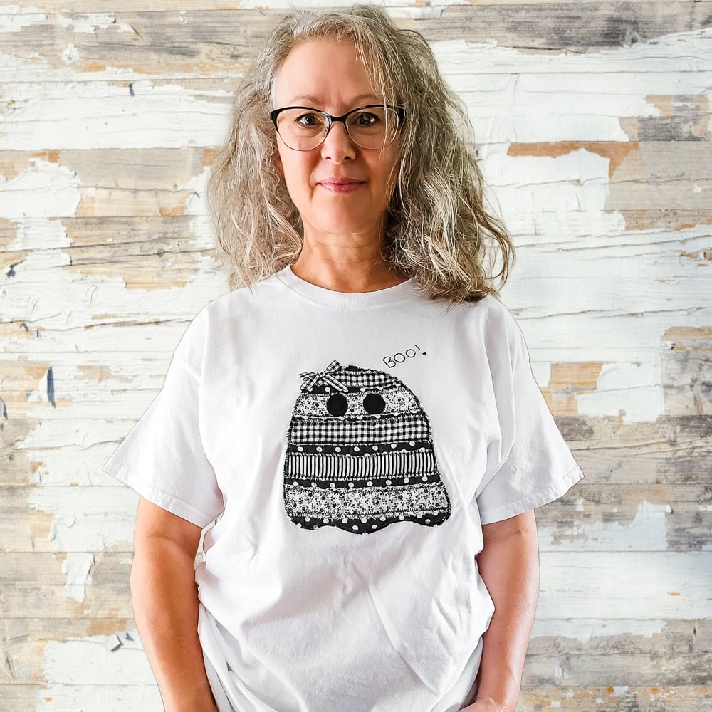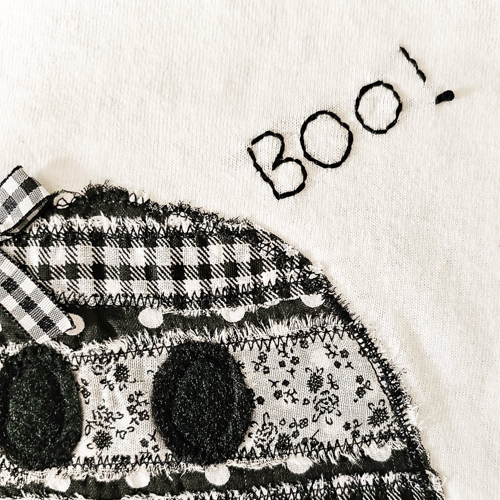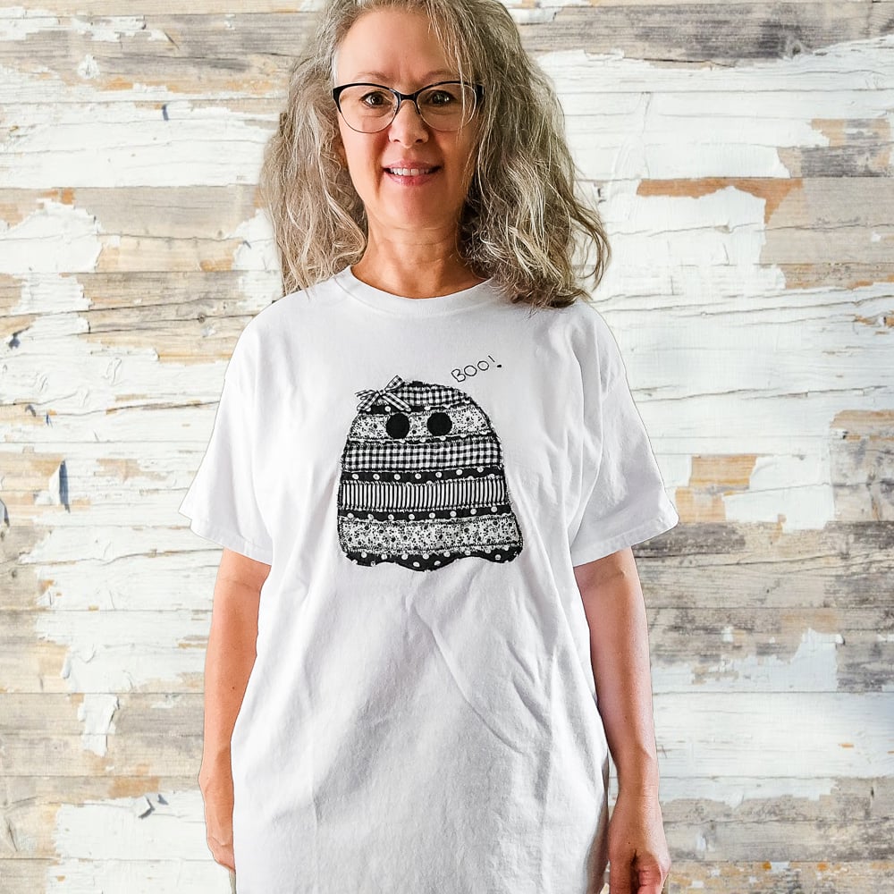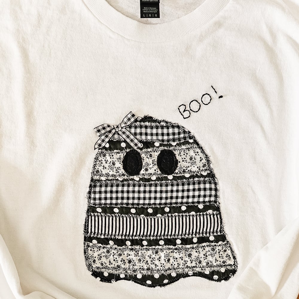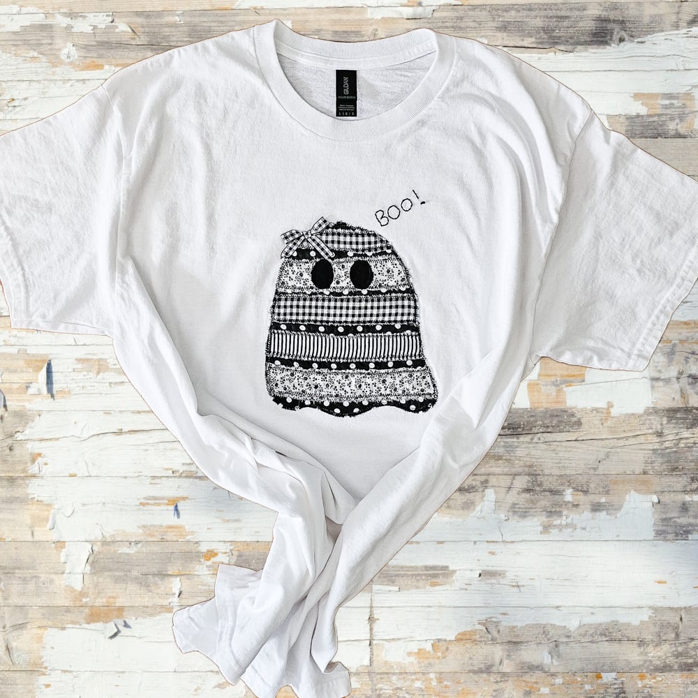 Charming patchwork ghost, machine stitched on a white Gildan cotton t-shirt. Includes hand embroidered BOO and ribbon accent. All materials have been prewashed and preshrunk. See my other designs, each is one of a kind.