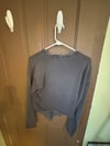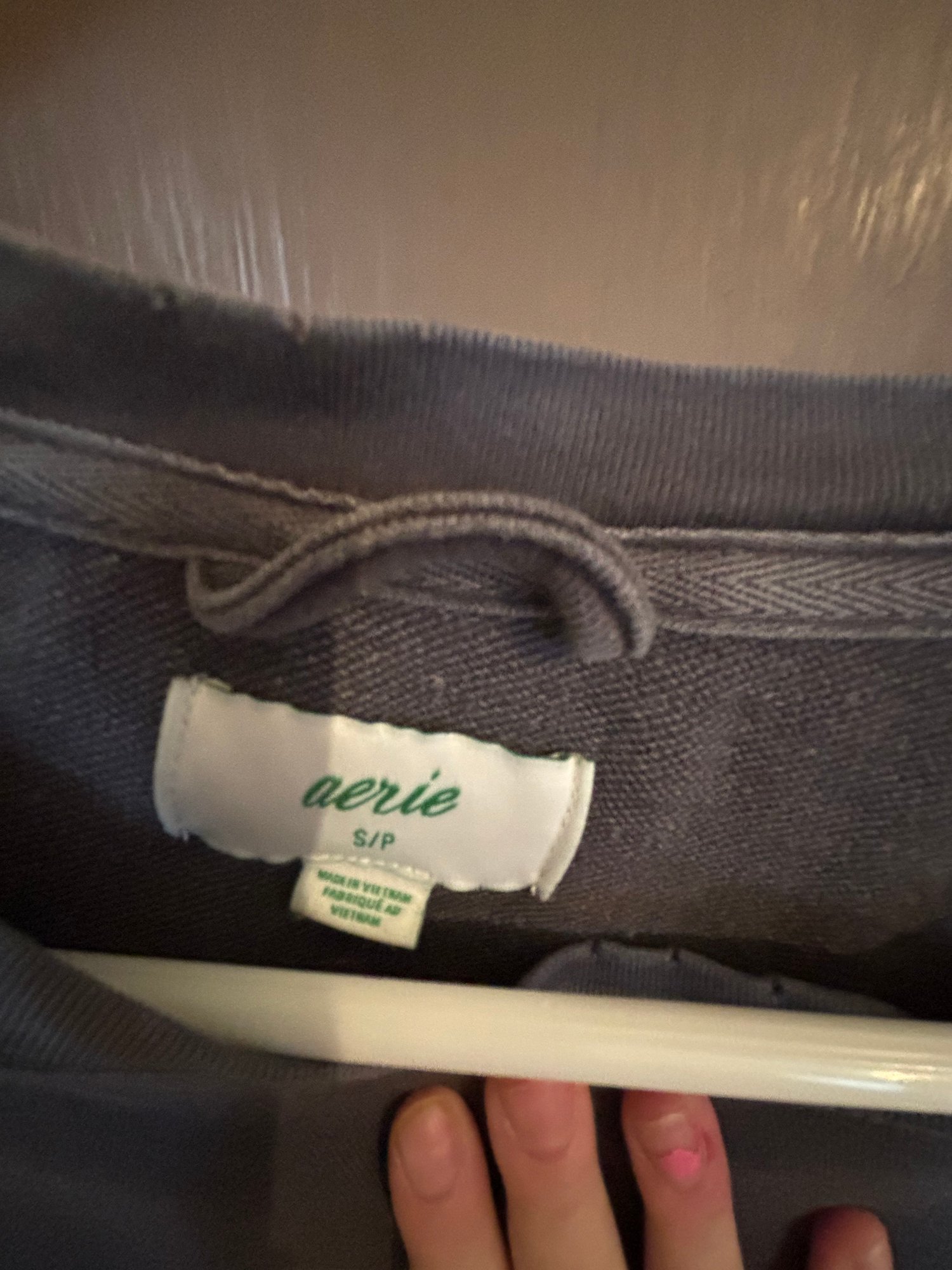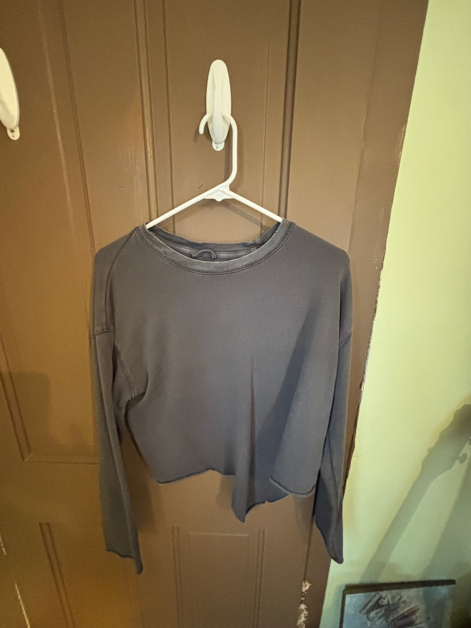 Super cute, soft and easy to wear, this charcoal gray Aerie long-sleeve sweatshirt features a relaxed fit and a raw, slightly uneven cropped hem for a casual, lived-in look. Crew neckline, dropped shoulders, and lightweight sweatshirt material make it perfect for layering or pairing with high-waisted jeans or leggings