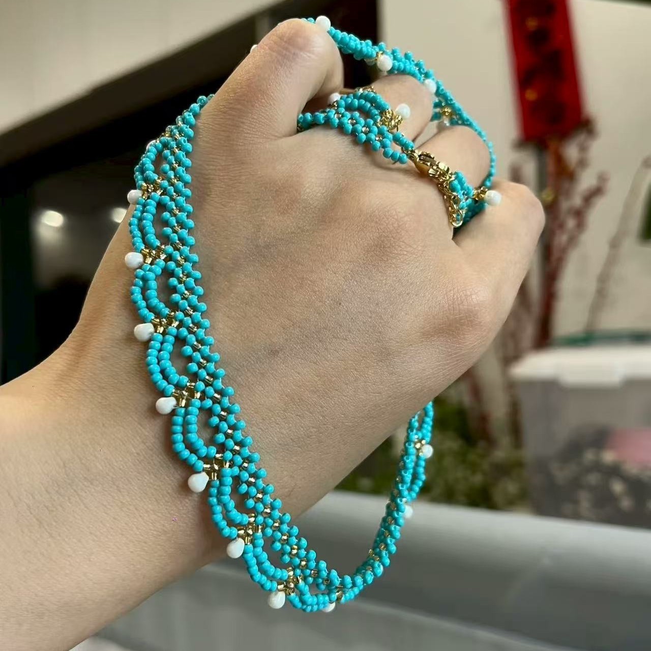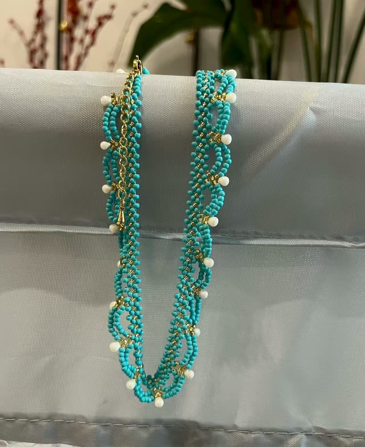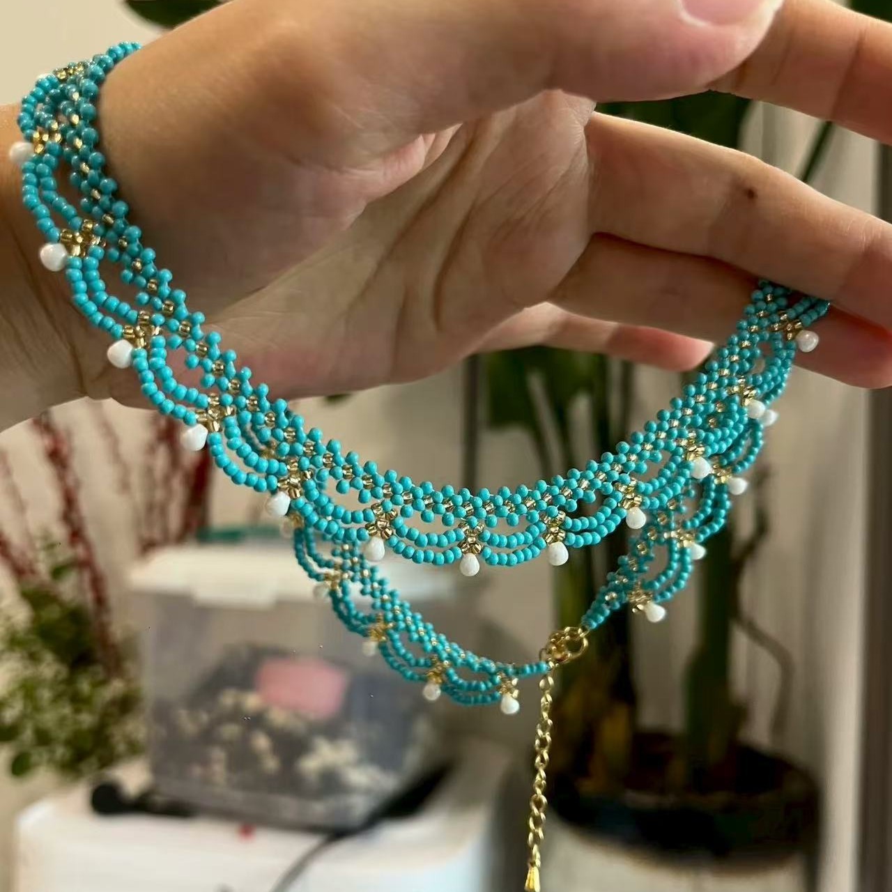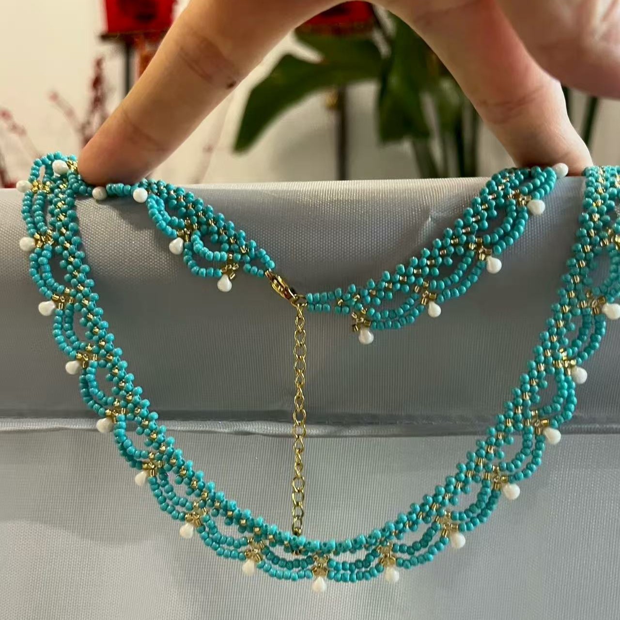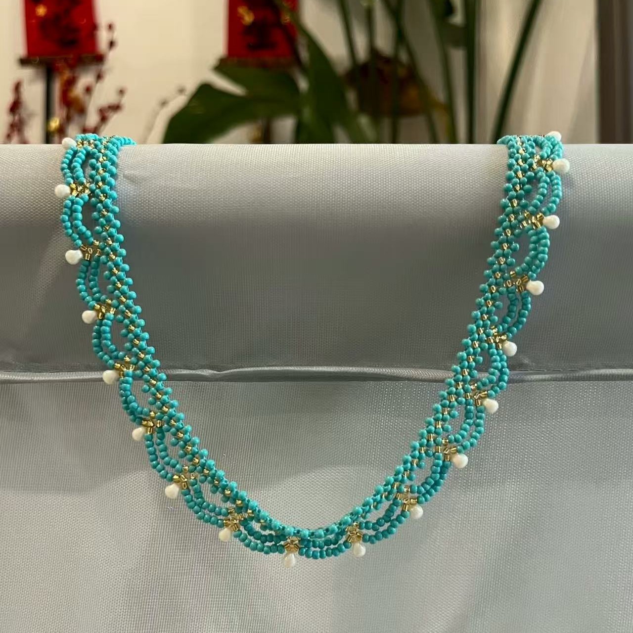 Handmade lace beaded blue-green court-style necklace