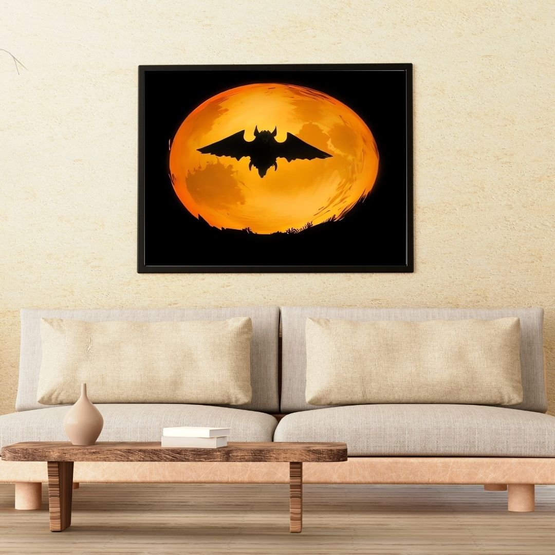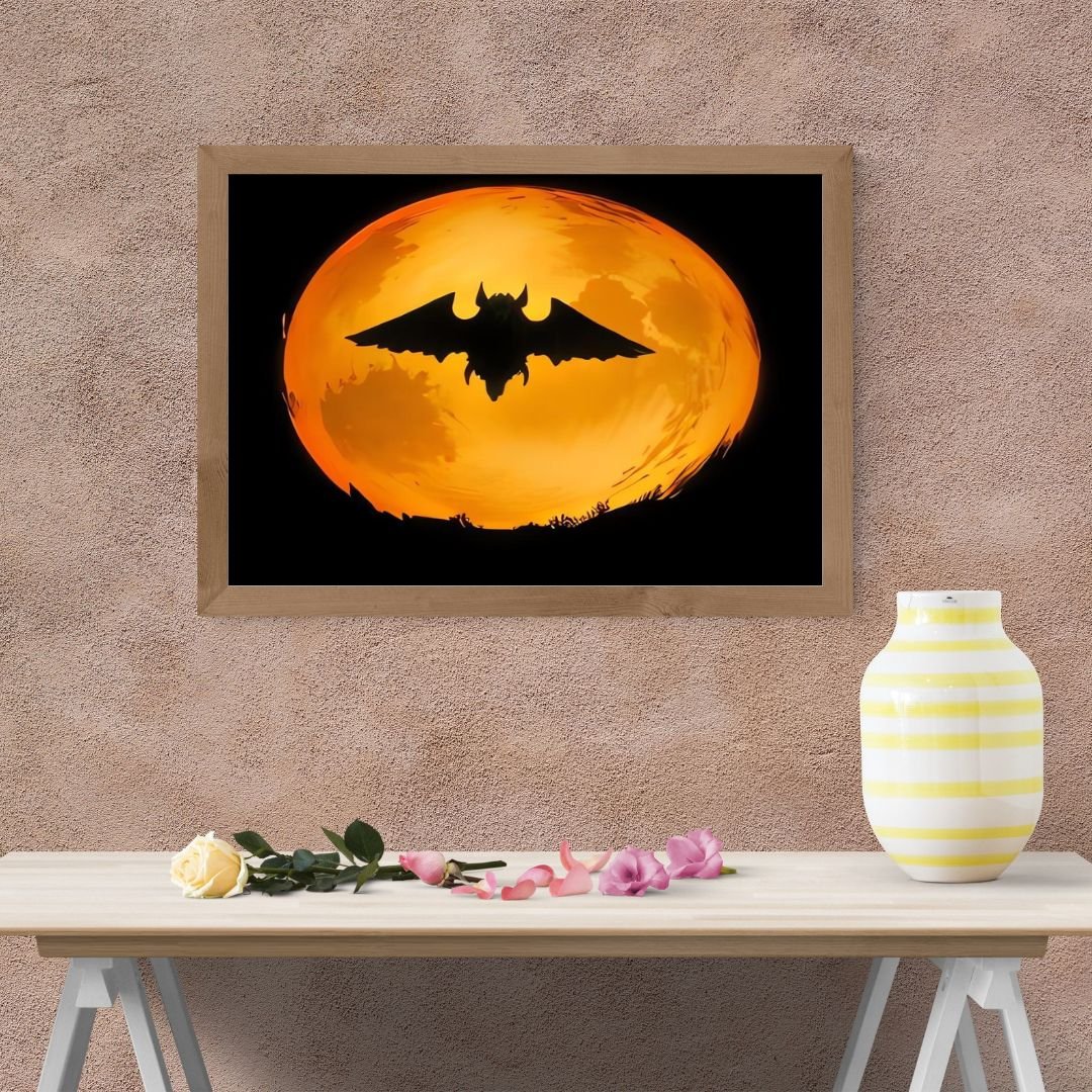 Immerse your living space in the mysterious allure of the night with "Enchanted Nocturne: Bat Silhouette Under Harvest Moon." This captivating digital wall art print beautifully captures the silhouette of a bat gracefully soaring beneath the warm, radiant glow of a harvest moon, evoking a sense of wonder and enchantment.