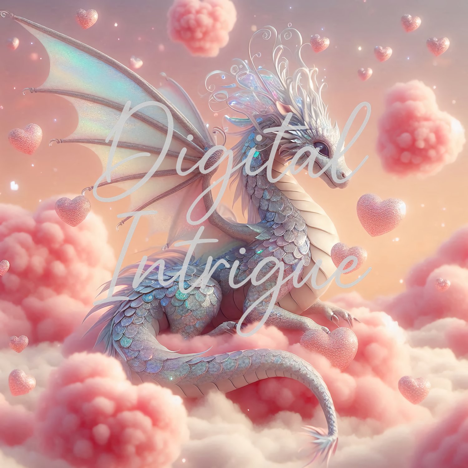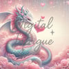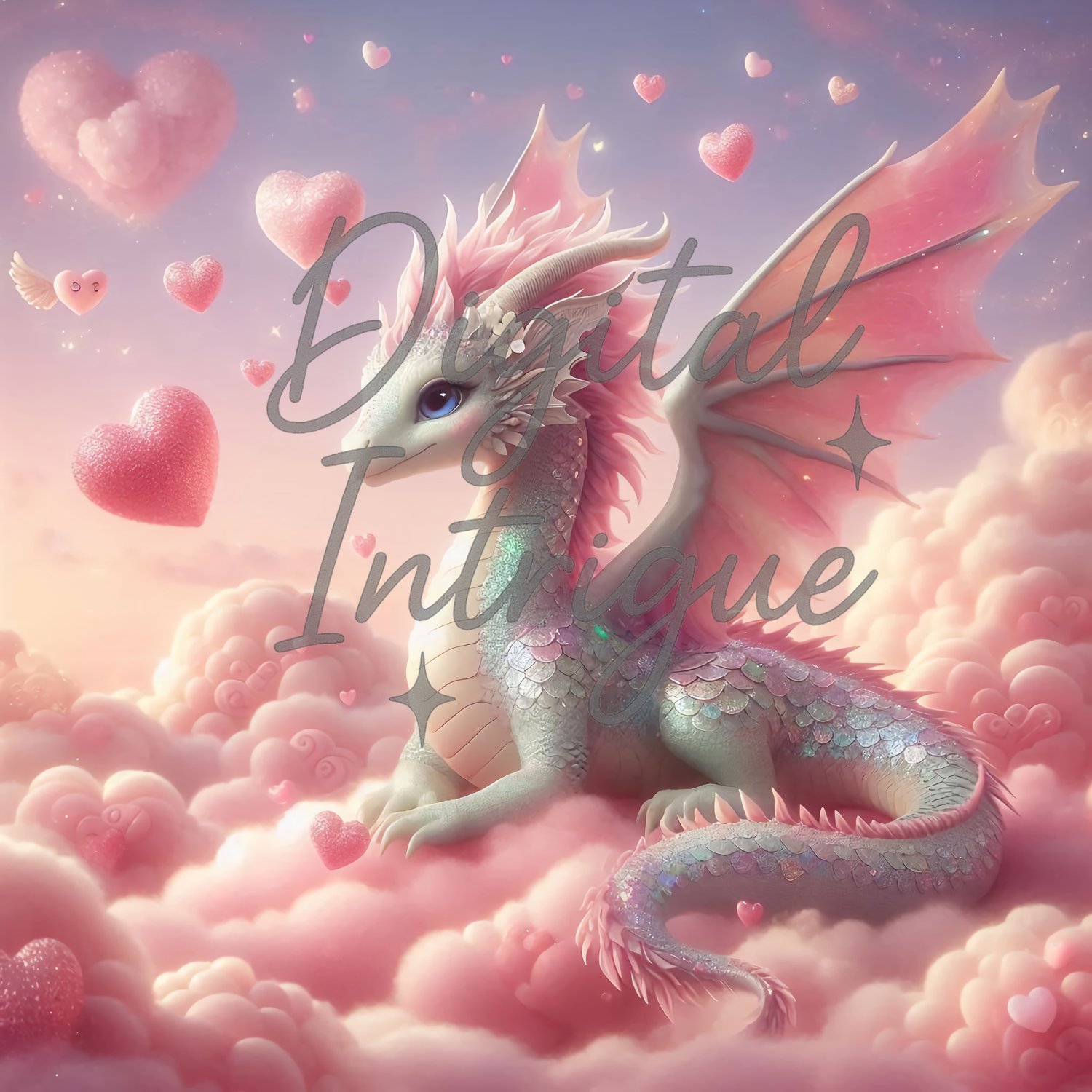 Keywords: pastel dragon art, fantasy digital download, pink cloud scene, romantic dragon illustration, whimsical printable, dreamy wall art, ethereal creature, magical decor, hearts and clouds