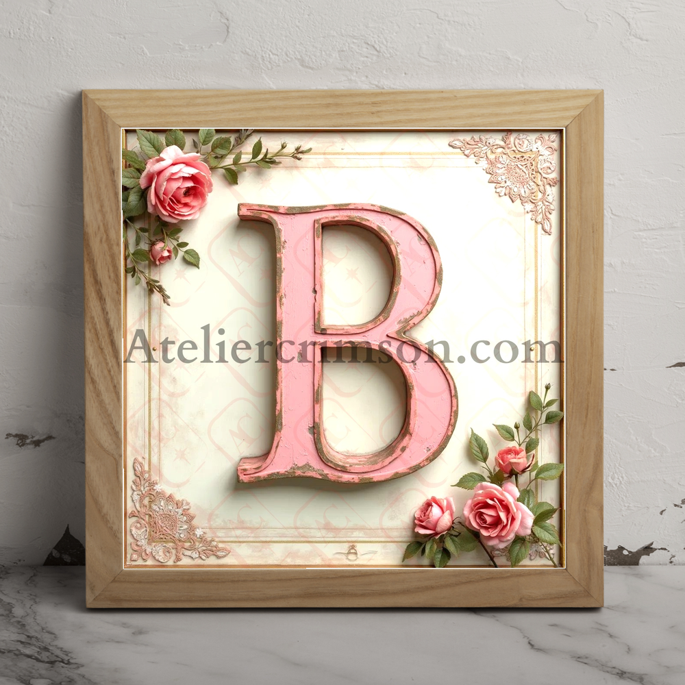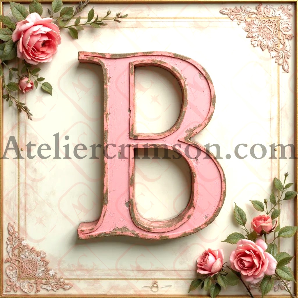The letter B pink and shabby chic This charming series presents the alphabet reimagined in a delightful shabby chic style. Each letter is crafted from weathered pink wood, standing proudly against a soft cream background. The collection exudes a romantic, vintage atmosphere with its elegant typography and subtle decorative elements.