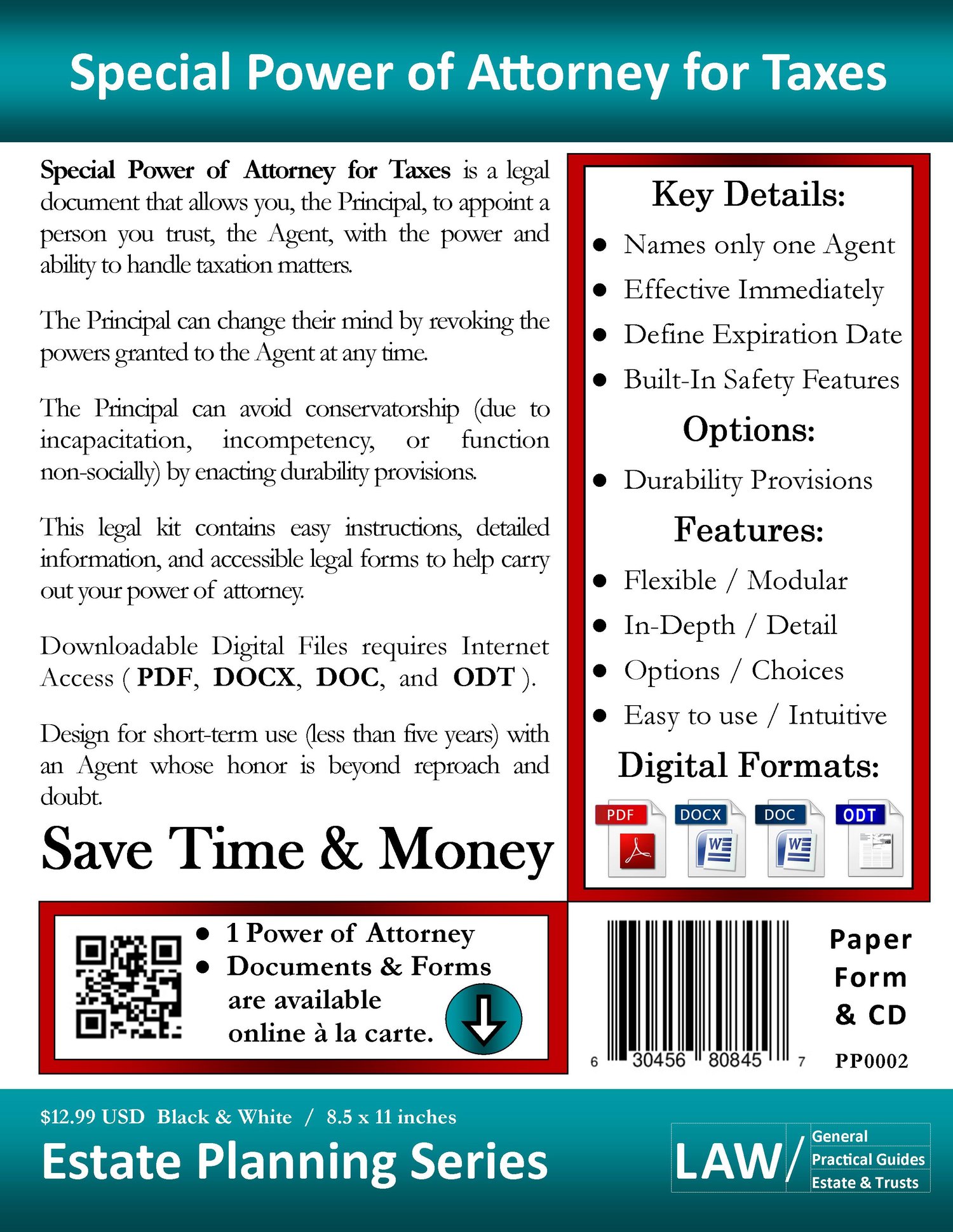 Special Power of Attorney for Taxes is a legal document that allows you, the Principal, to appoint a person you trust, the Agent, with the power and ability to handle taxation matters.