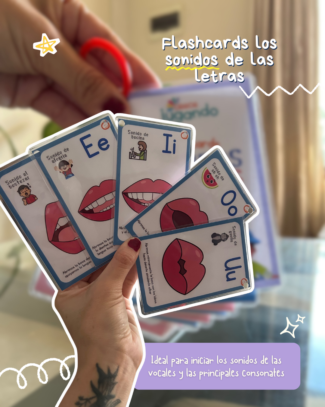 Estas flashcards son un recurso educativo diseñado para iniciar la conciencia fonológica y facilitar la conexión entre la letra escrita y su sonido correspondiente.