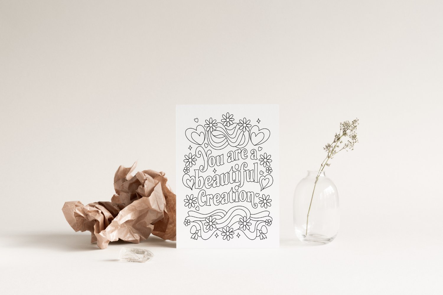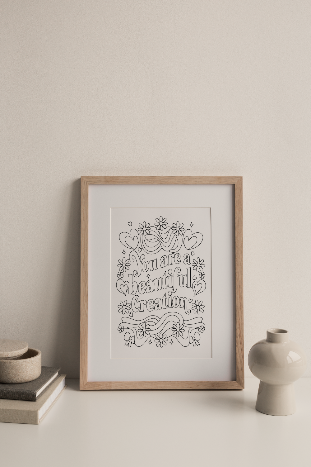 This coloring page highlights the phrase : "You are a Beautiful Creation. God's creation is beautiful and humans are made in God's image."