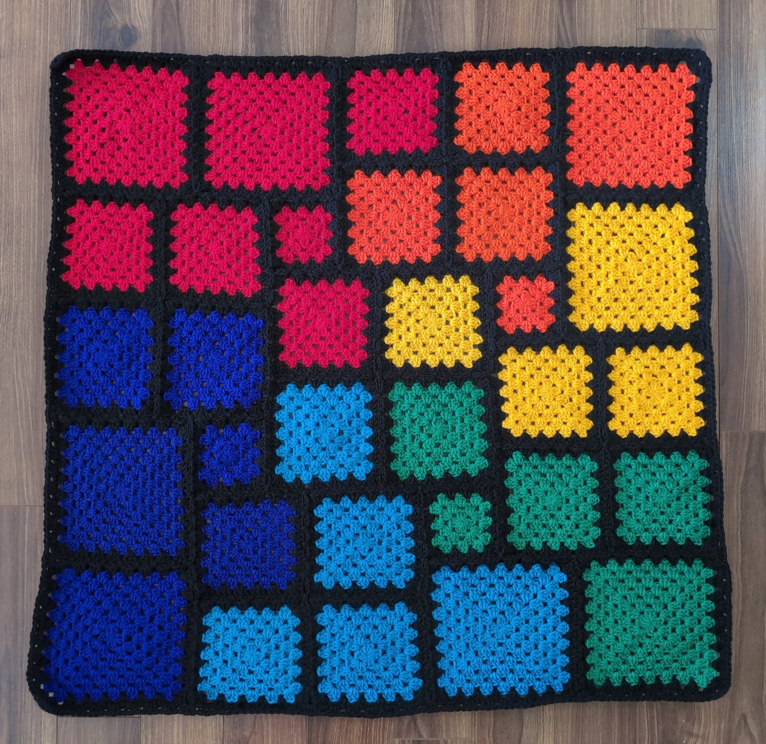 Finished size is approximately 12 times bigger than your 3-round square. Sample measures 40” square.