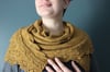 Ode to the moon, Selenian shawl has a crescent shape bordered on one side with cables on garter stitch and, on the other side, with a lace and cable border.