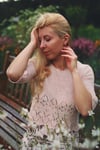 Nenya is a fitted, cropped pullover or summer top with set-in sleeves or a tank top. The bottom body part is richly decorated with intricate lace panels which smoothly transform into elegant twisted rib stitches. Hem and cuffs are finished with lovely, shell-like, scalloped edge. Twisted stitches naturally highlight your curves and provide a comfortable garment to wear. The simple scoop neck is finished with one row of bound off stitches. The arm openings in tank top version are finished in the same way. The main difference between sizes is the number of lace panels on the body and scallops on the cuffs.