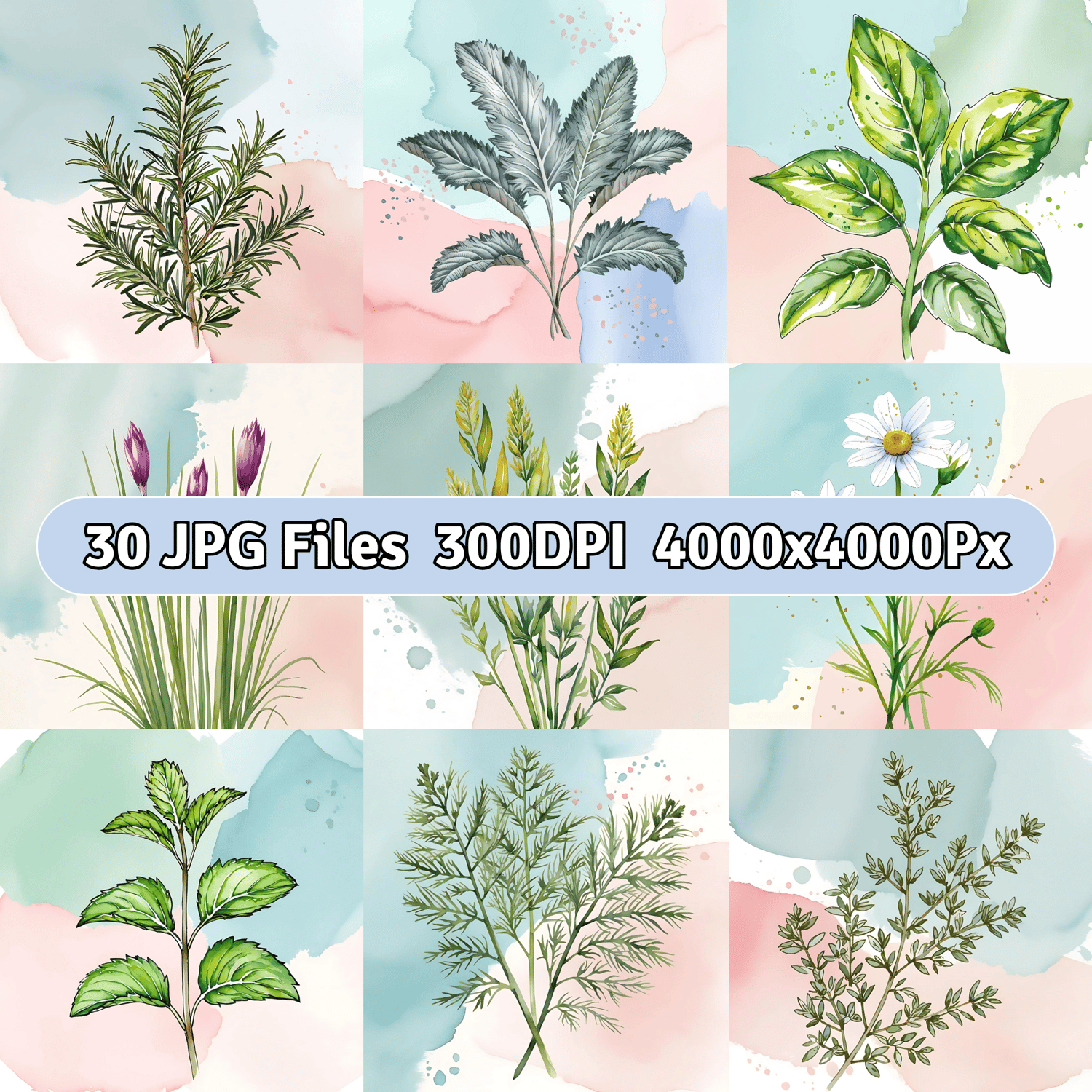 This peaceful and nature-inspired set features 30 high-quality botanical backgrounds with herb motifs such as chamomile, parsley, lavender, and more. The powder blue and blush pink watercolor tones give each image a refreshing, modern aesthetic, complemented by layered textures and soft edges.