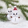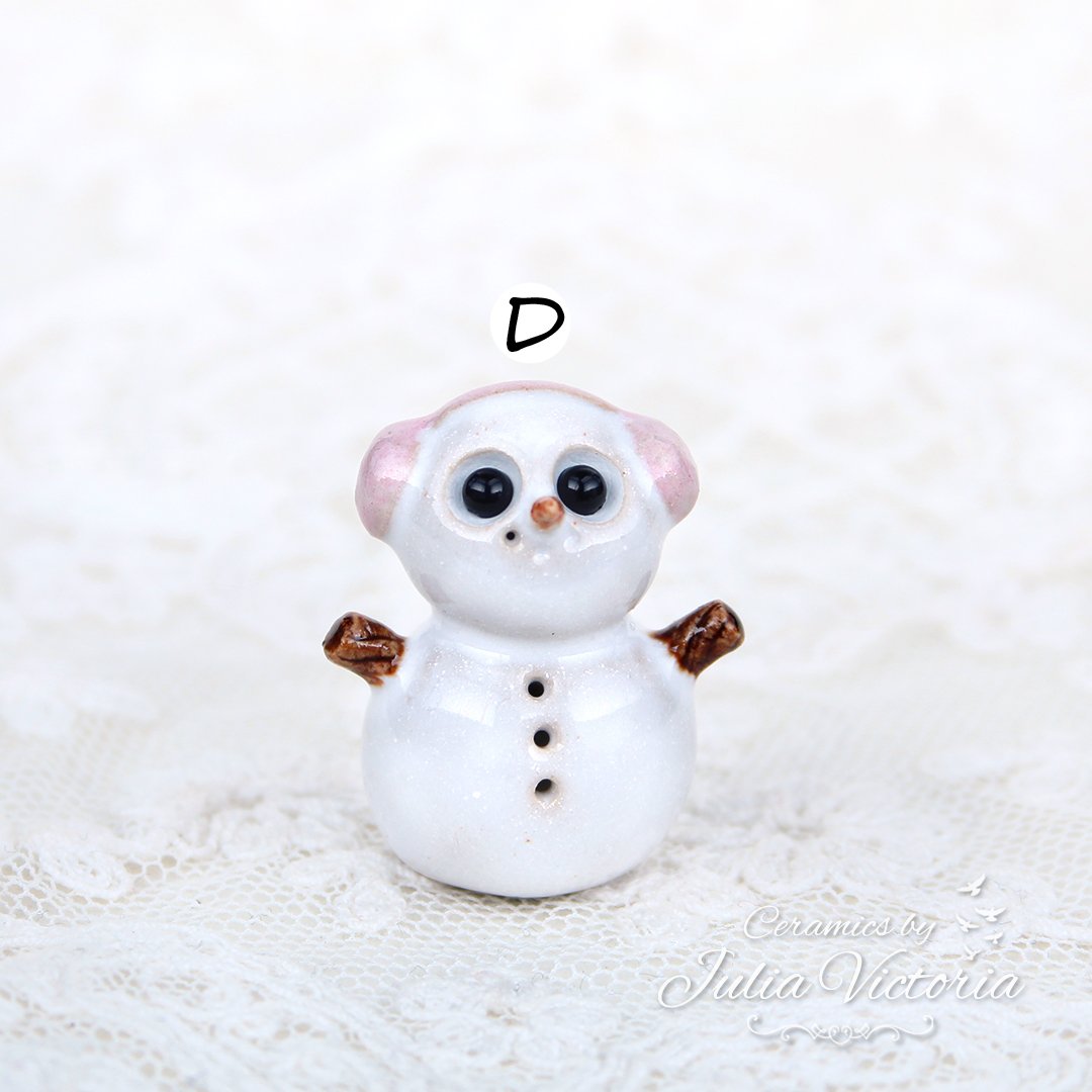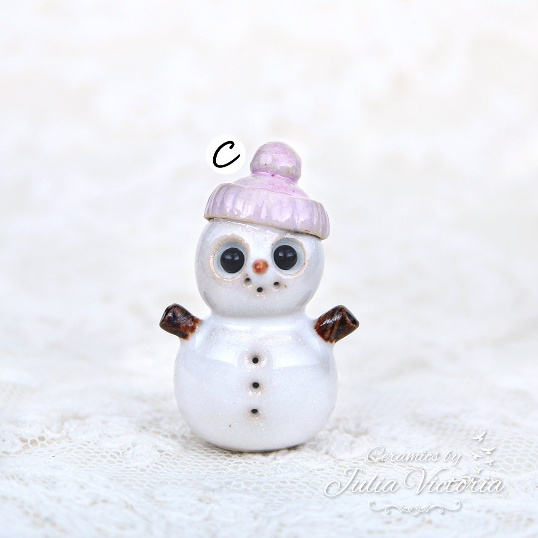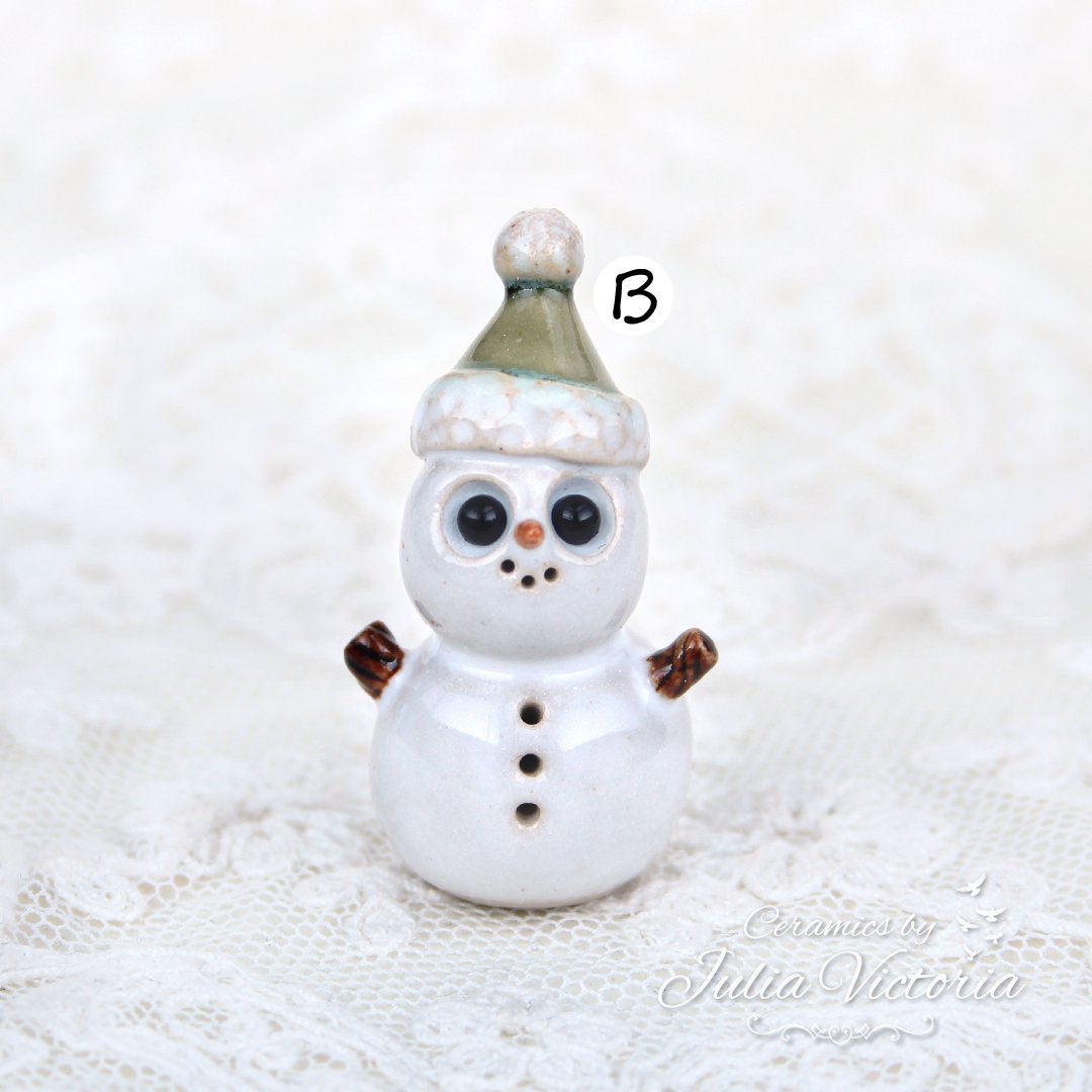 These cute little snowmen are looking for a new home. They are hand-sculpted in ceramics, glazed and painted by me