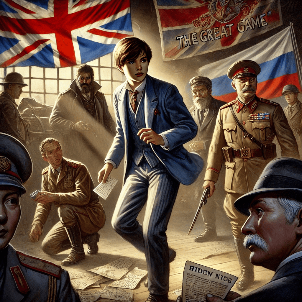 At the center is a sharply dressed young man in a light blue suit, caught mid-motion, clutching a secret message. His expression reveals urgency and alertness, suggesting he is a young spy or agent navigating the treacherous world of espionage. Around him, stern-faced military officers, spies, and informants gather in a dimly lit room lit only by shafts of daylight. British and Russian flags hang overhead, with one bearing the ominous words: "The Great Game."