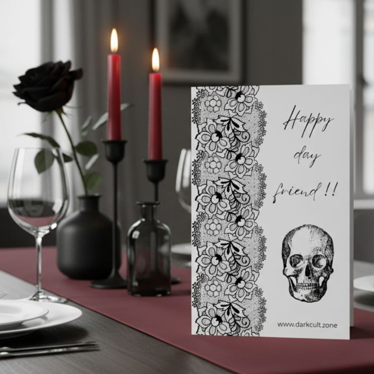 This printable gothic card transforms a simple greeting into an atmospheric gesture.