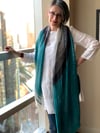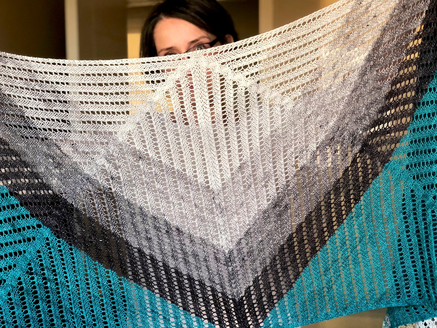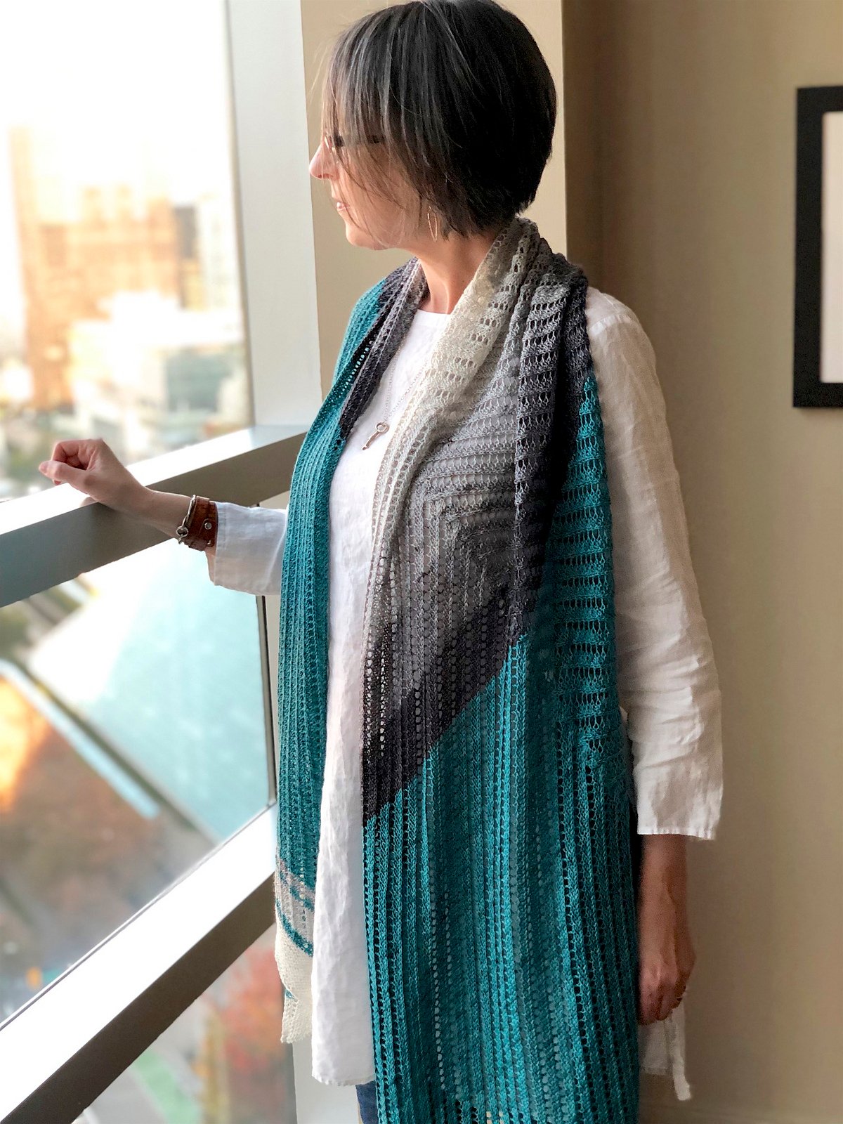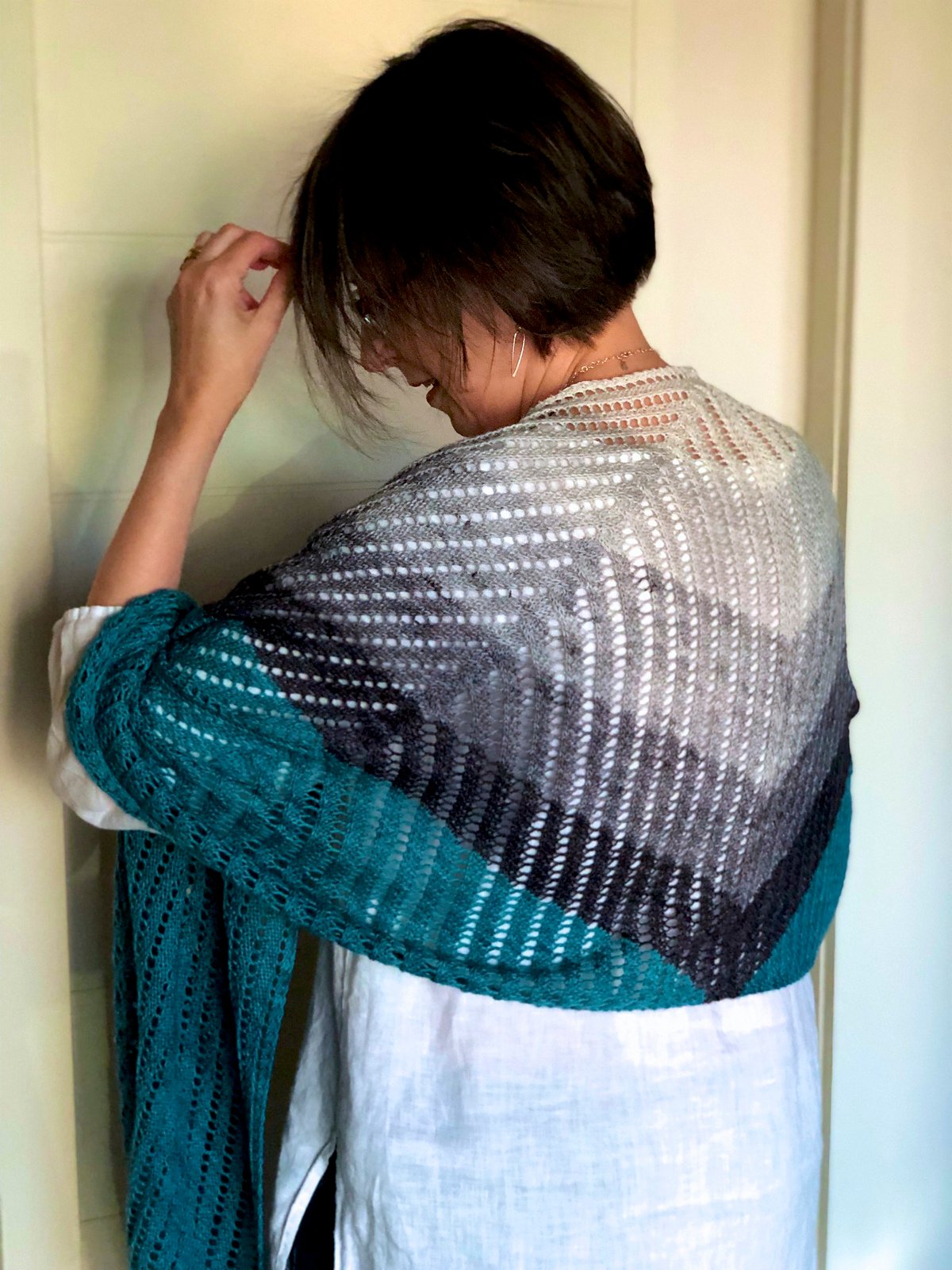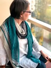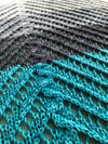 Lines of eyelets emerge at right angles from snaking cables, emphasizing the graceful length of this shawl as a simple gradient triangle extends into a trapezoid that wraps over the shoulders. On one side, the mini-skeins are reintroduced for a final flutter of narrow stripes.