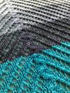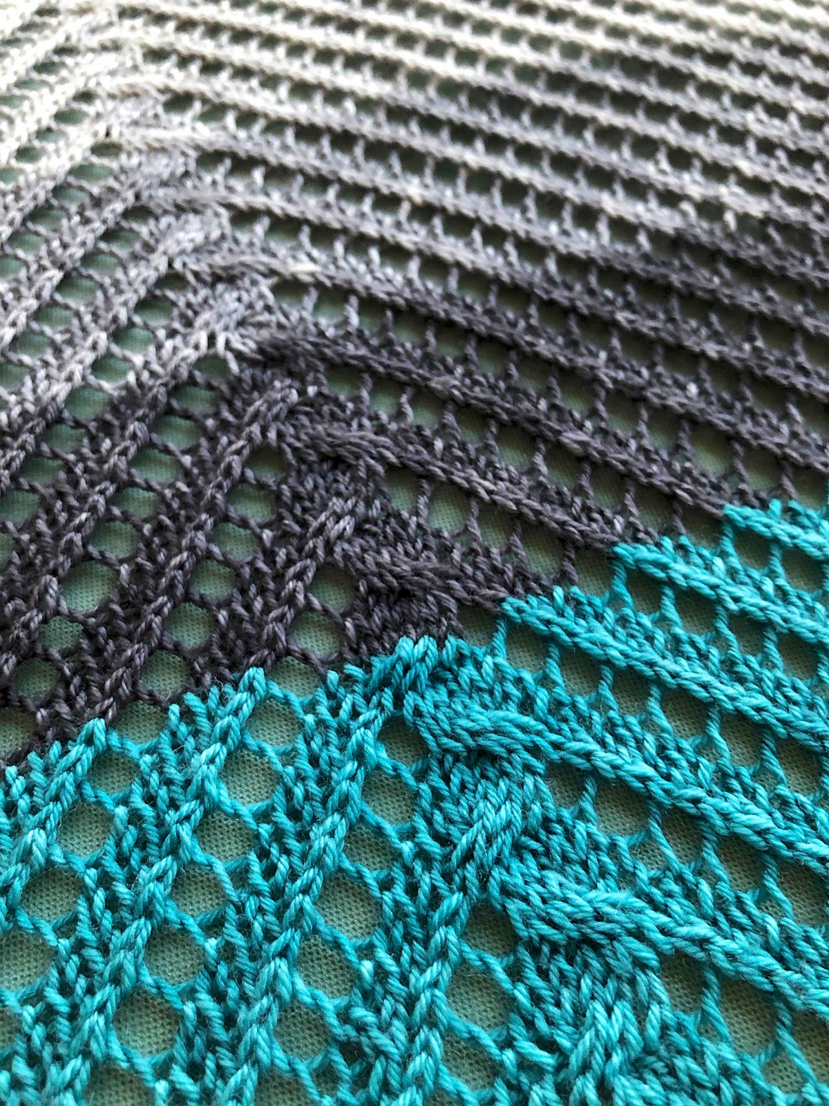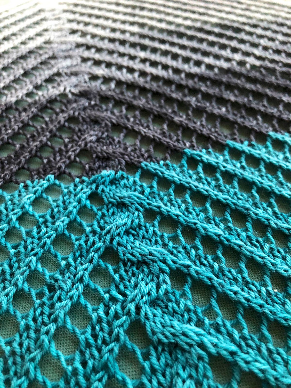 The shawl begins with a standard top-down triangular shawl construction, which becomes the centre of the shawl. Then each side of the triangle is worked out laterally.