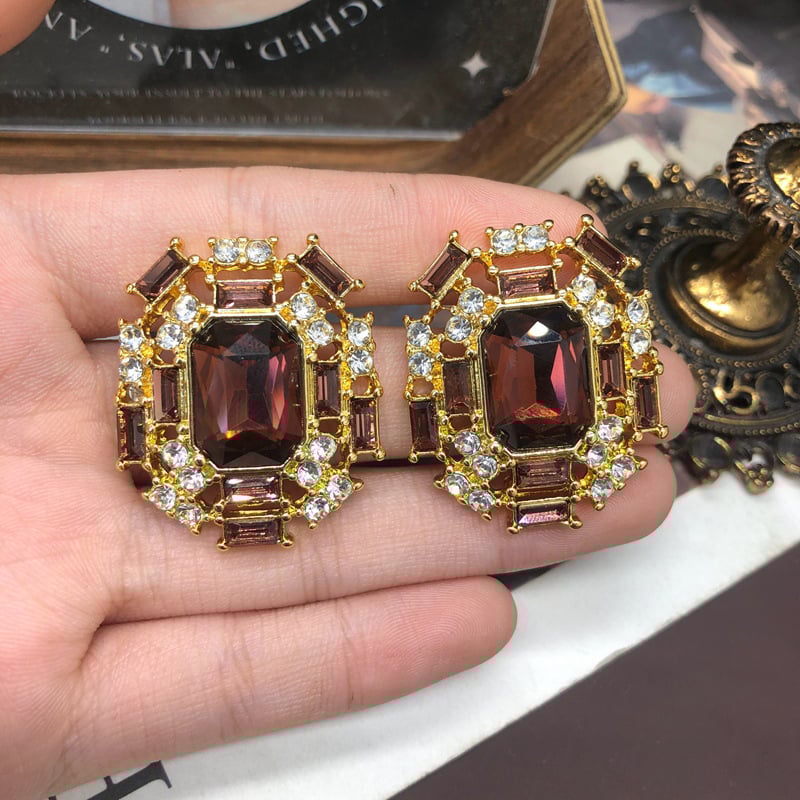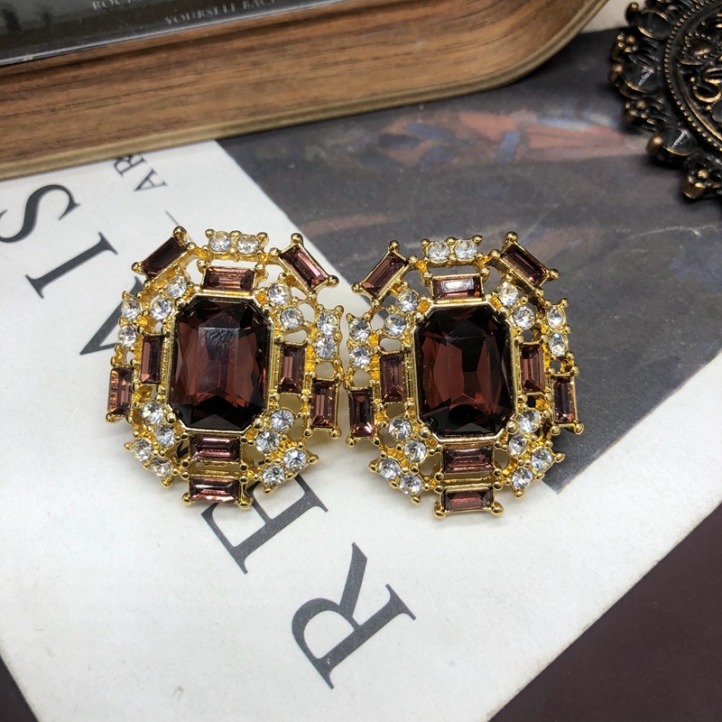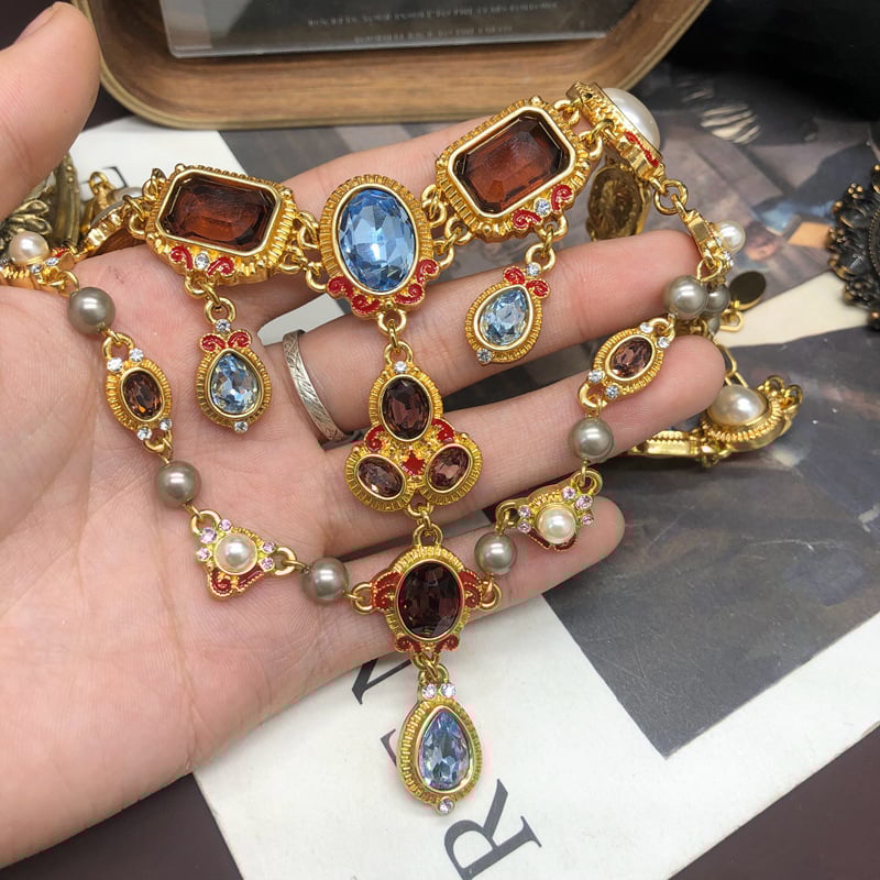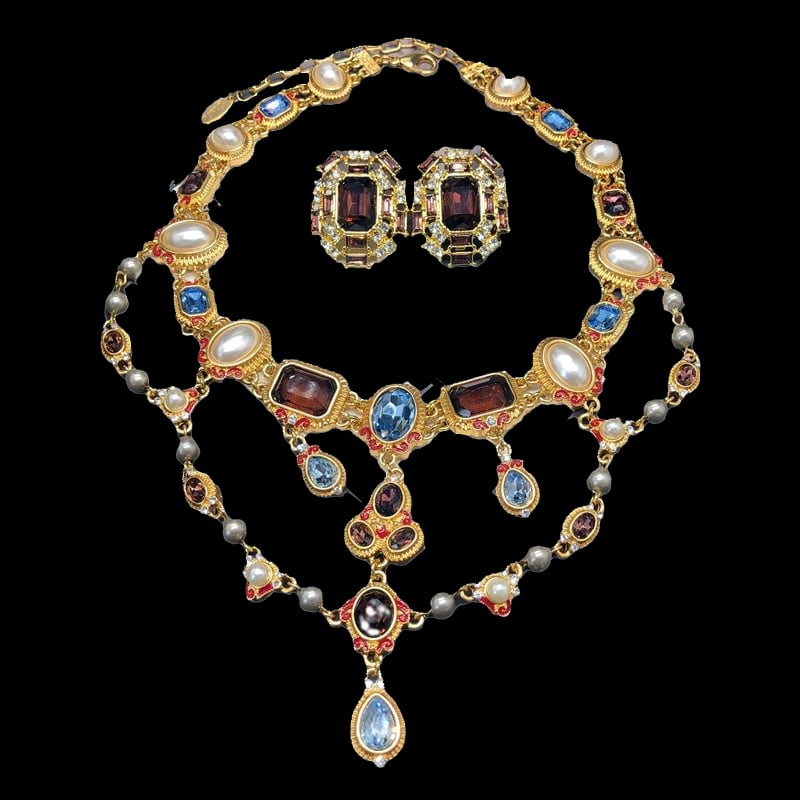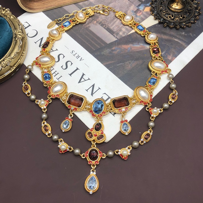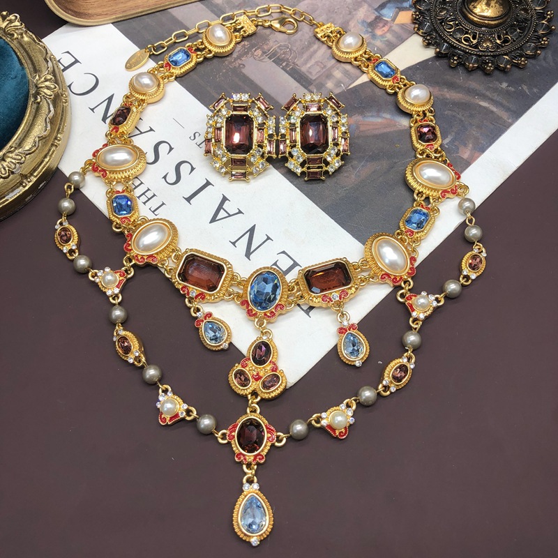 Vintage court-style pearl colorful crystal diamond stud earring necklace set