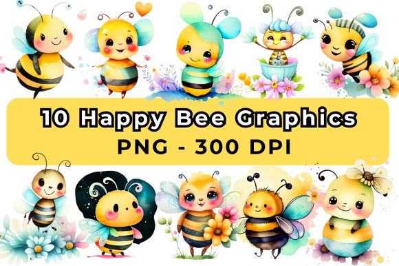 10 Happy Bee Clipart Graphic PNG files in size: 5000 x 5000 pixels in 300 DPI with transparent background.