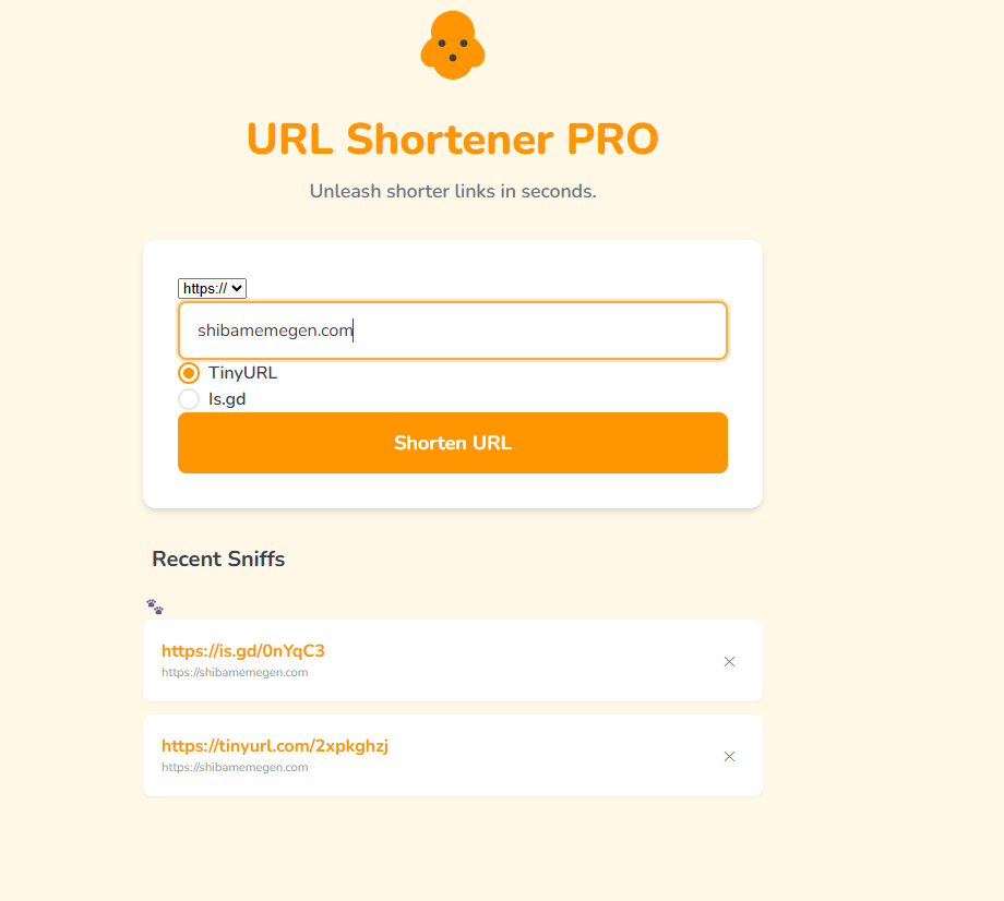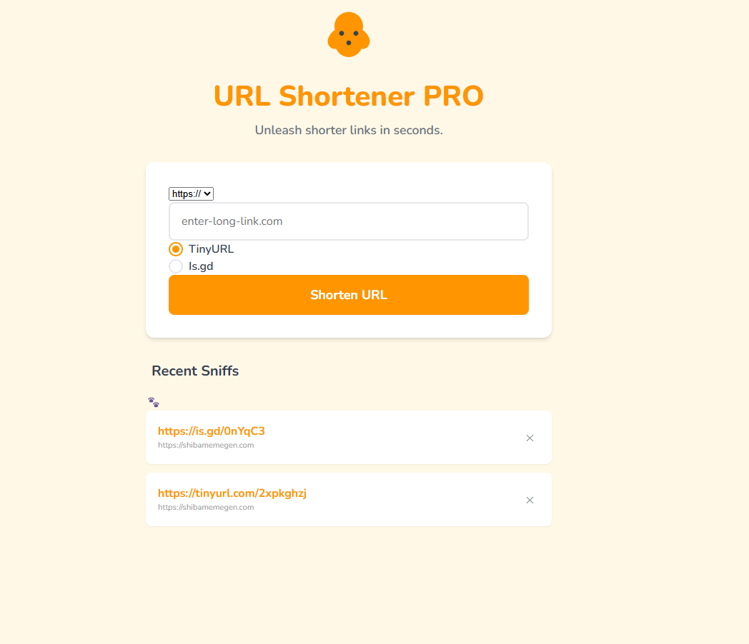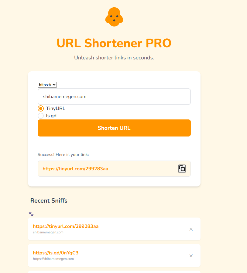 - 🐾 Browser-Based History Tracking: The "Recent Sniffs" history card automatically saves users' recently shortened links directly in their browser—giving them a personalized dashboard without you needing to host a user database!