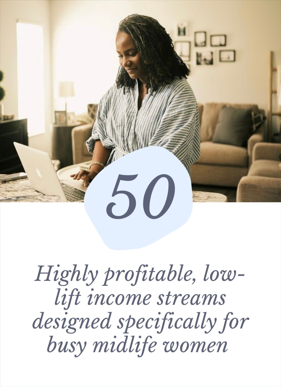 Inside the free guide, you'll discover 50 income stream ideas you can start, based on skills and knowledge you already have. Whether you're a corporate professional, founder, educator, creative or caregiver who's been laid off, opted out, or just done feeling financially stuck, this guide offers real, sustainable ways to start earning consistent income without burning out.