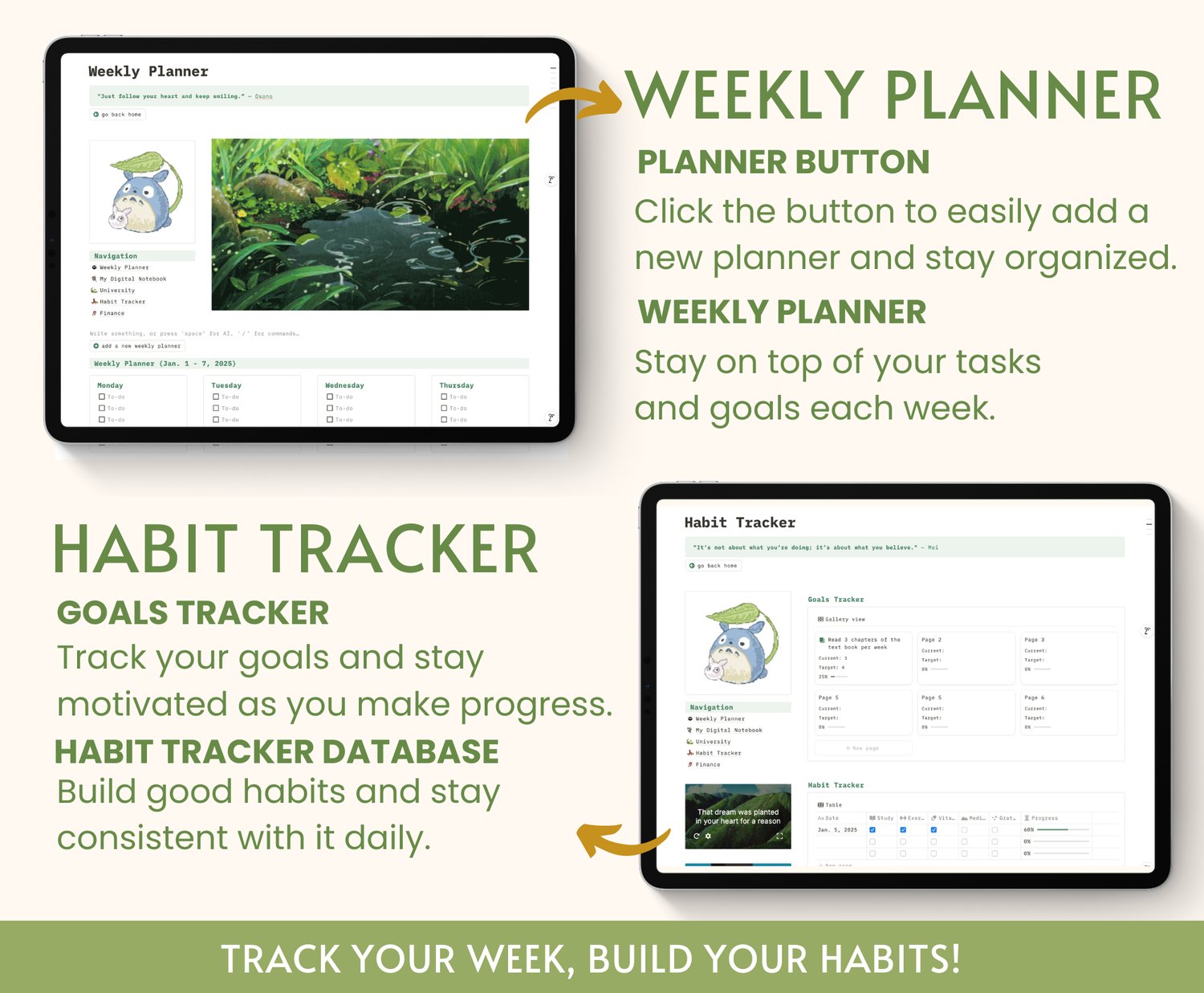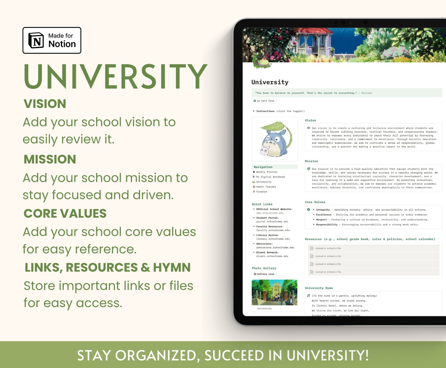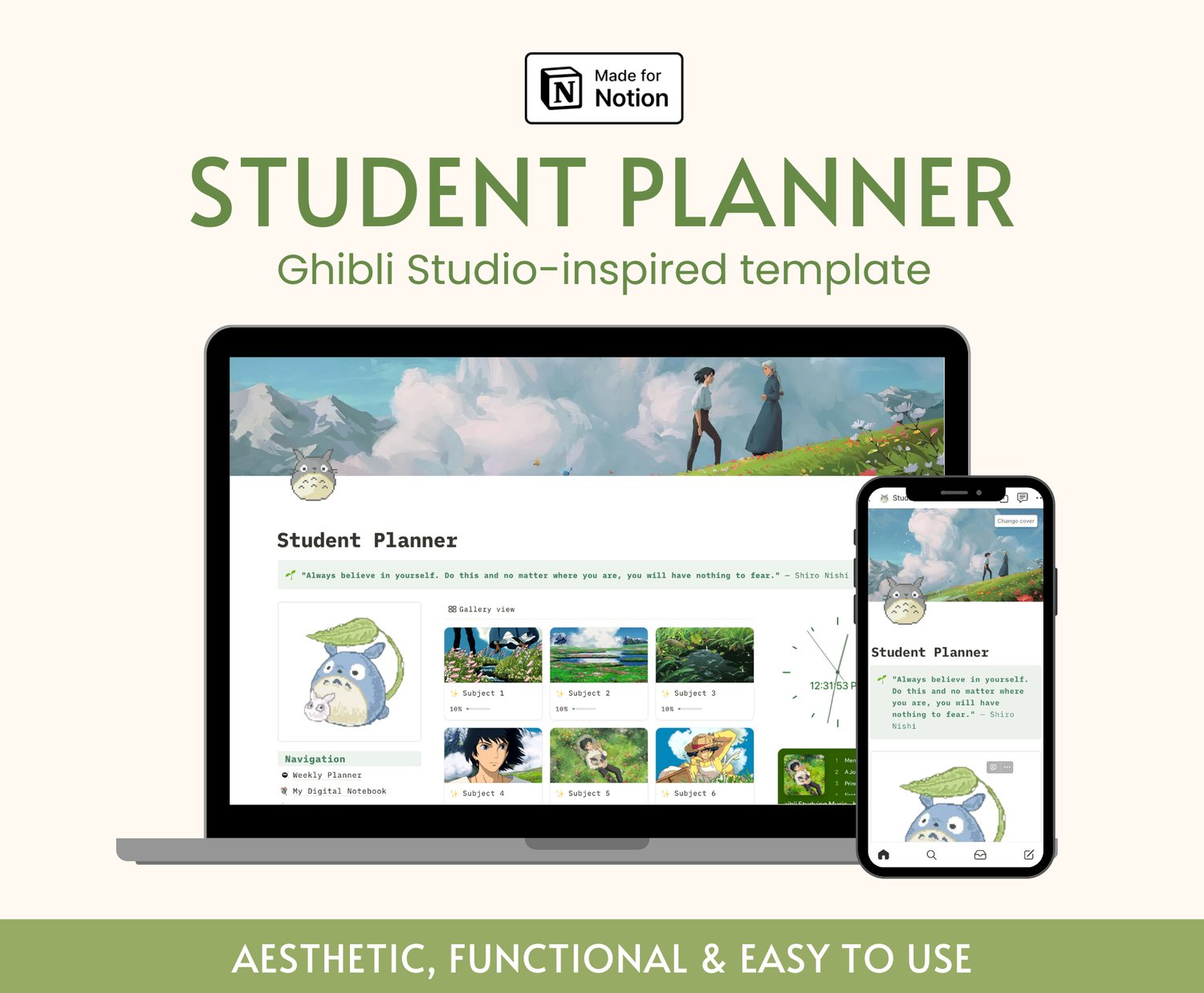The 2025 Studio Ghibli Notion Template is the perfect all-in-one student planner for the year ahead. Featuring an aesthetic student dashboard, this college planner helps you stay organized with ease, from assignments to school activities. With its user-friendly design, this assignment and school planner template is ideal for students looking to streamline their academic life.